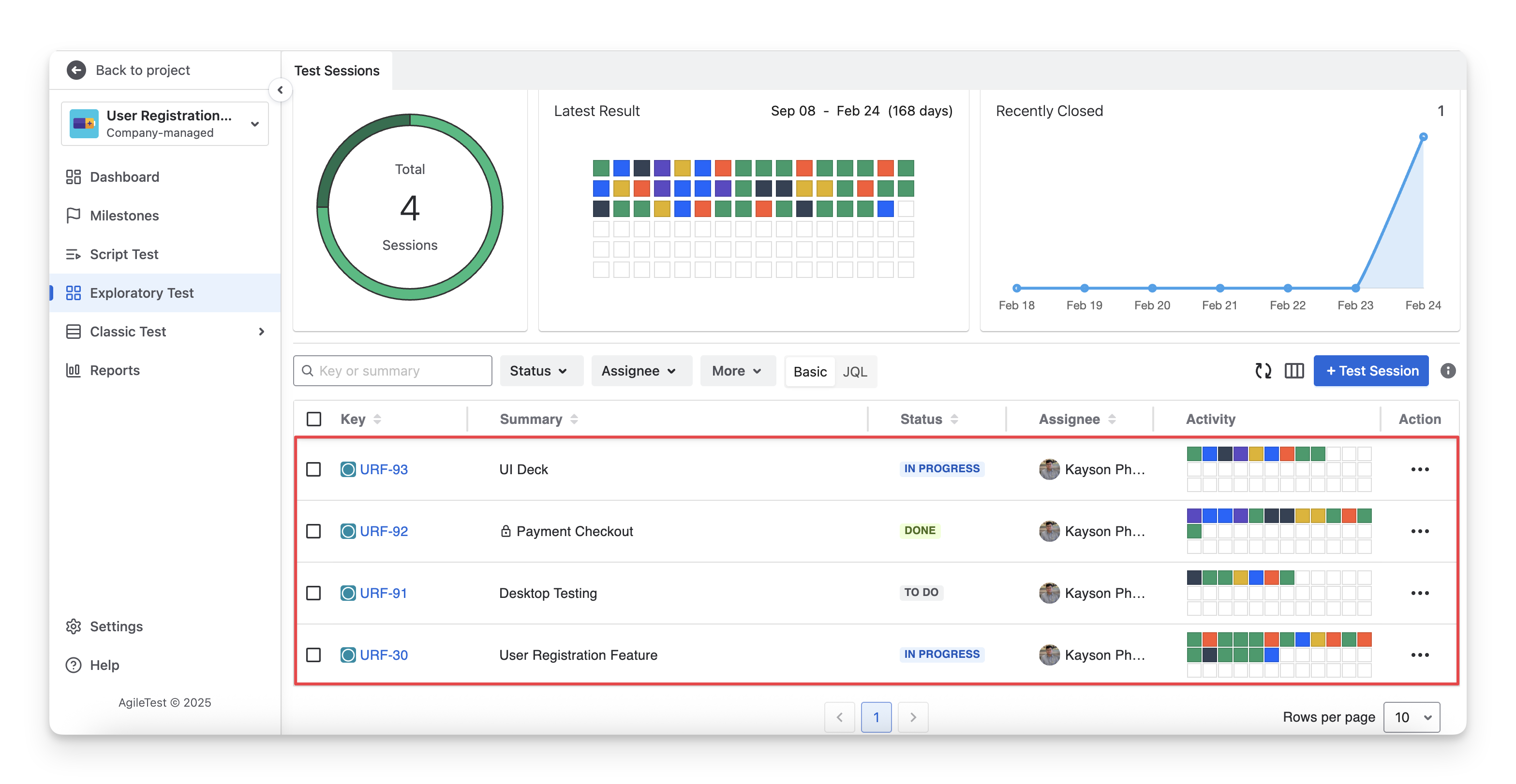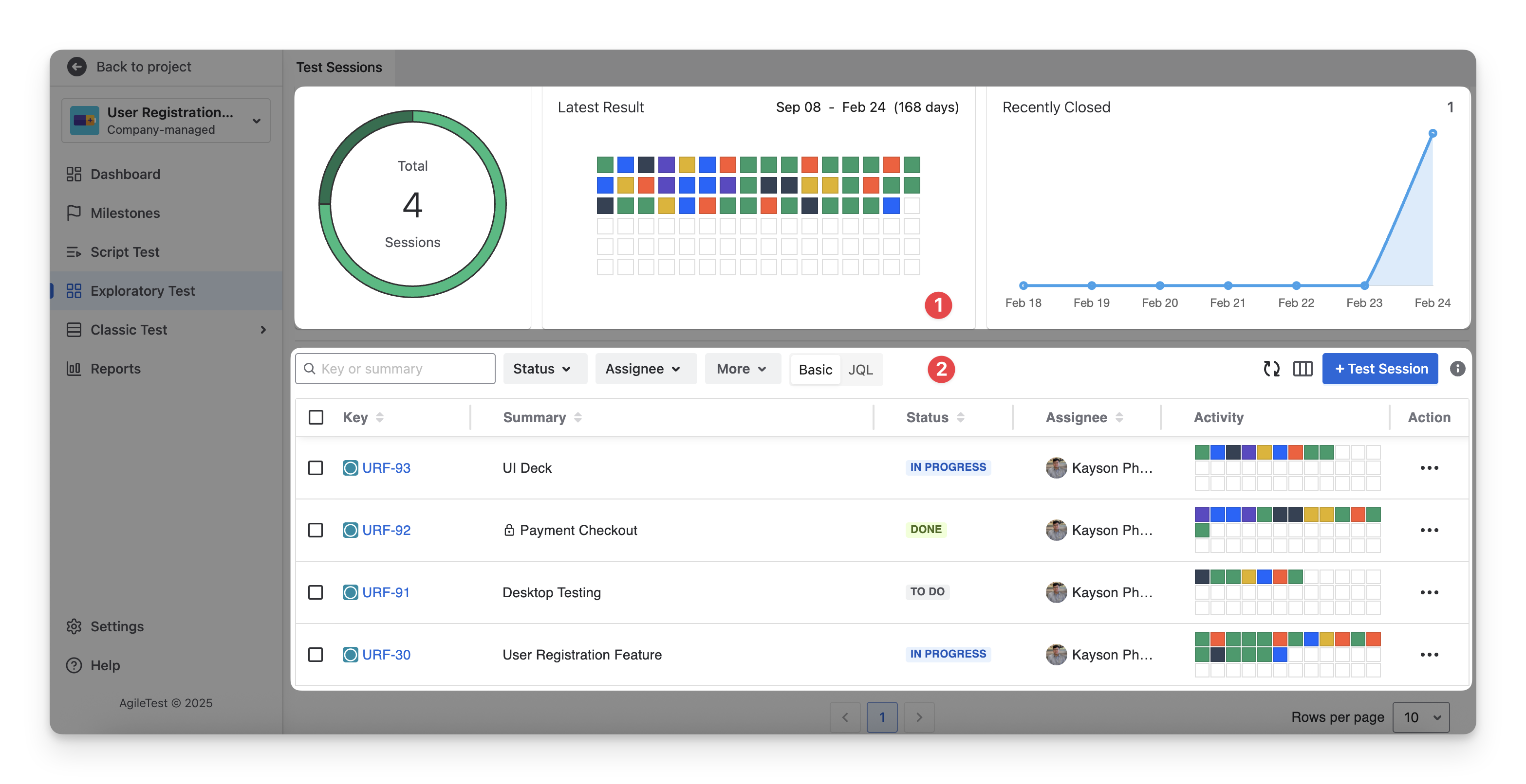 Exploratory Test Detail Table: Allows you to manage, track, and monitor individual exploratory test sessions, including their status, assignee, and activity.