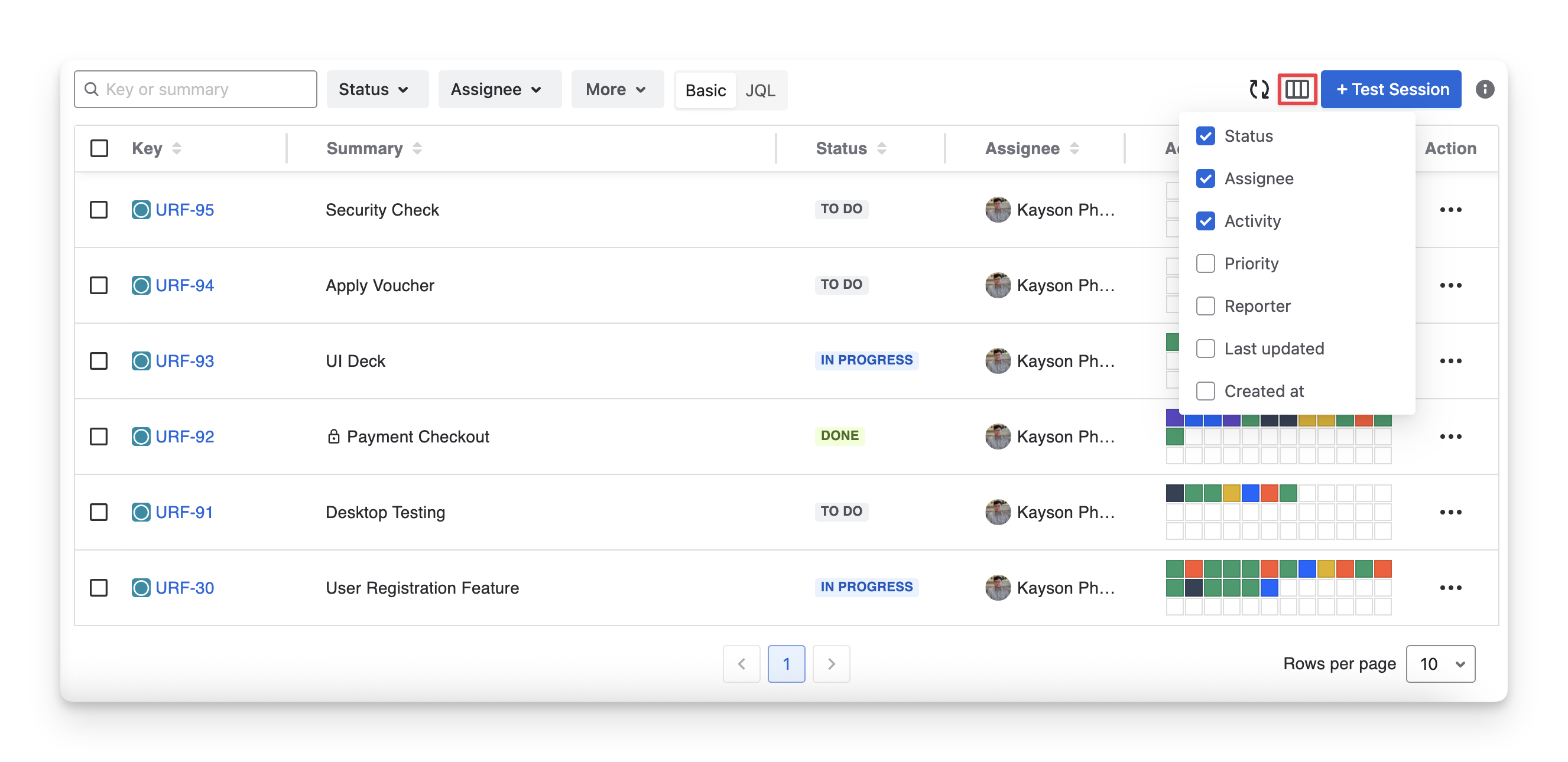 Assignee: your team members assigned to test sessions.