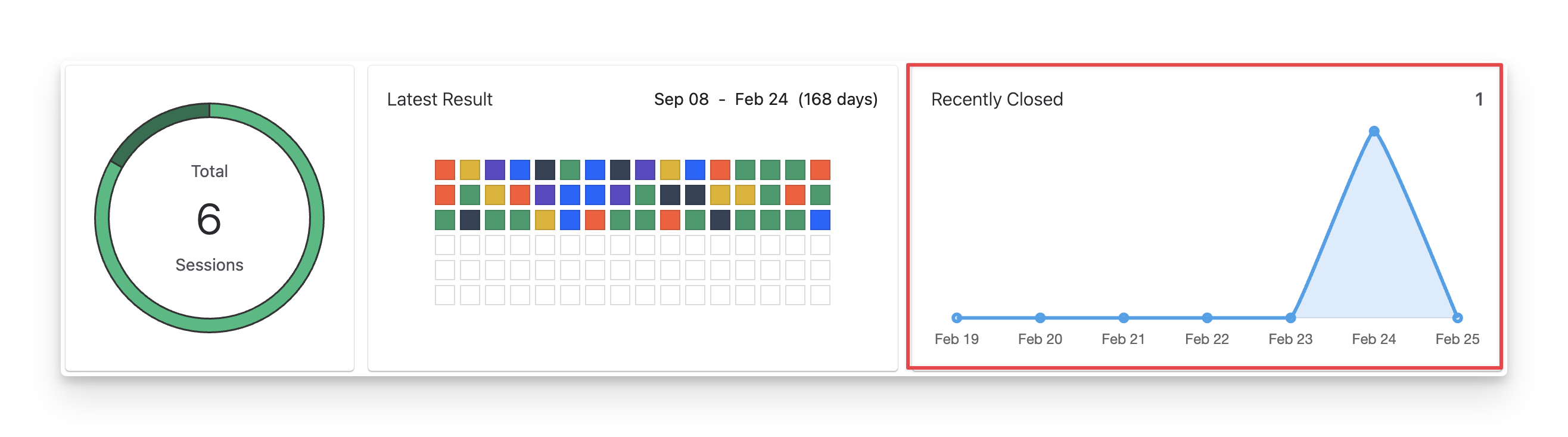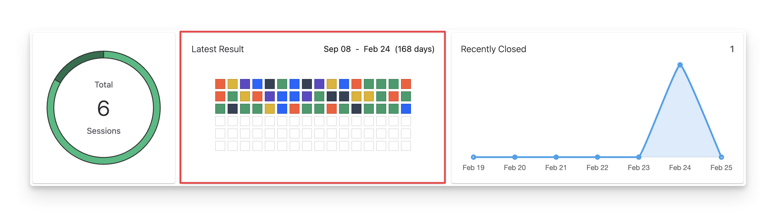 The Latest Result chart visually summarises recent exploratory testing outcomes from the first active test session to date. Each small square represents the result of a Test Session item (an individual note or finding recorded during a session). The colors indicate the Test Session Item Status, including: