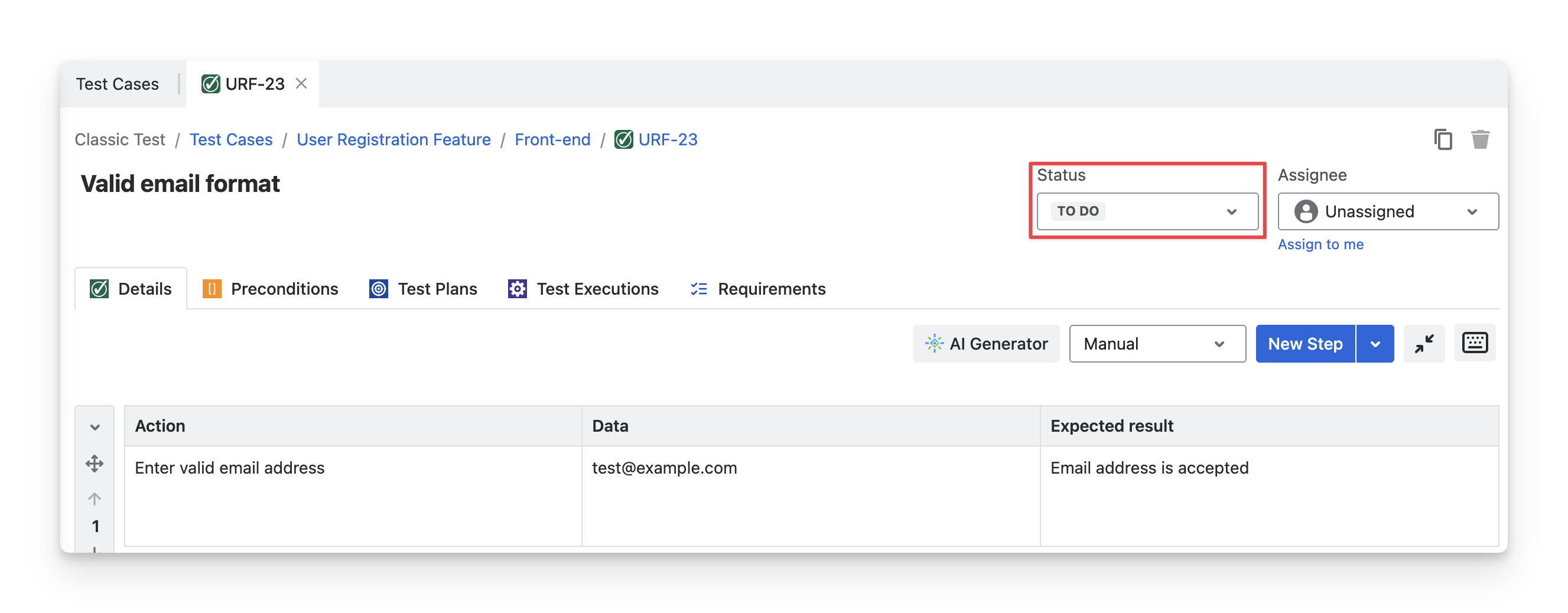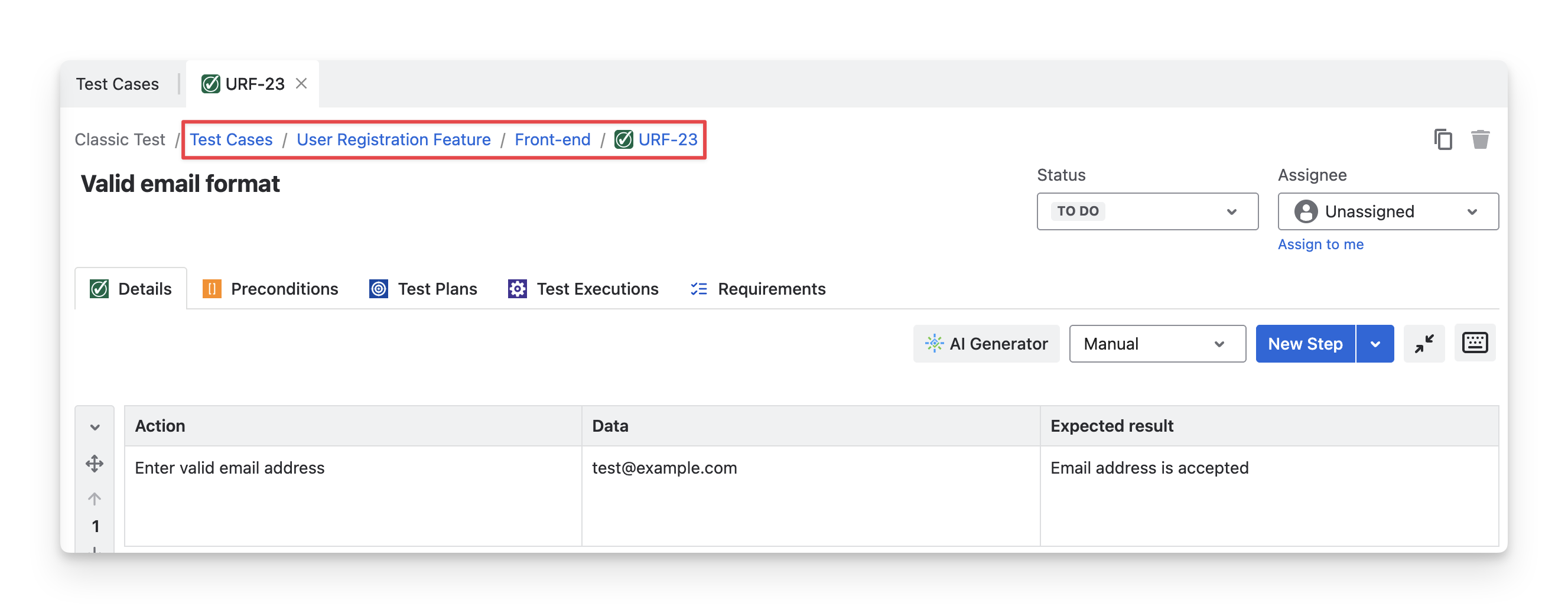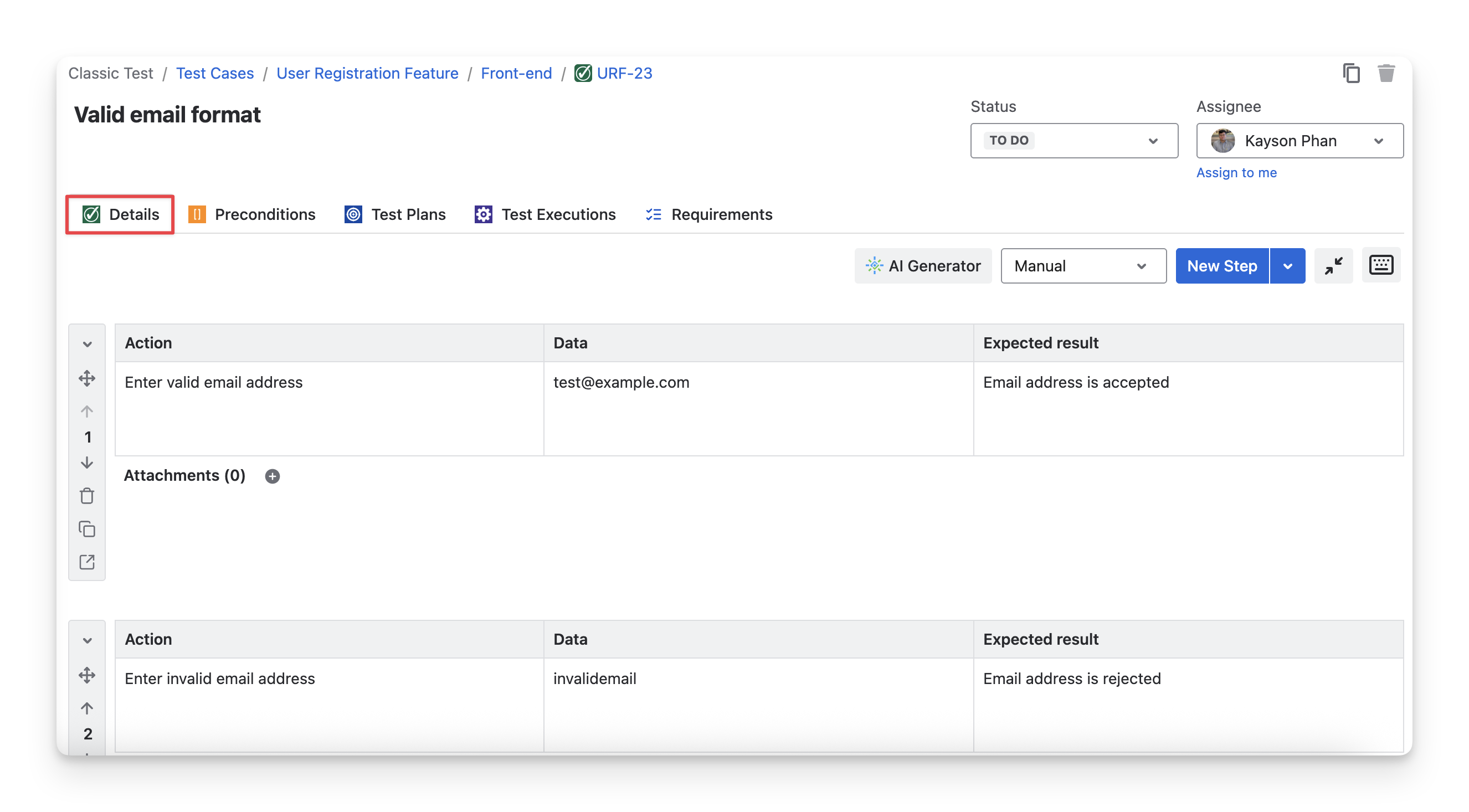 For Manual test cases, the Details tab includes a dedicated area for test steps. Each test step consists of an Action, Sample Data, and Expected Result.