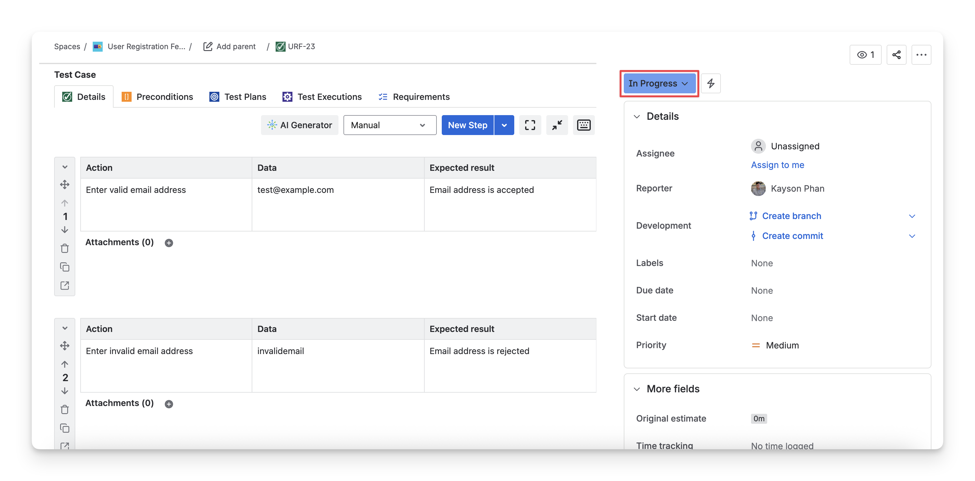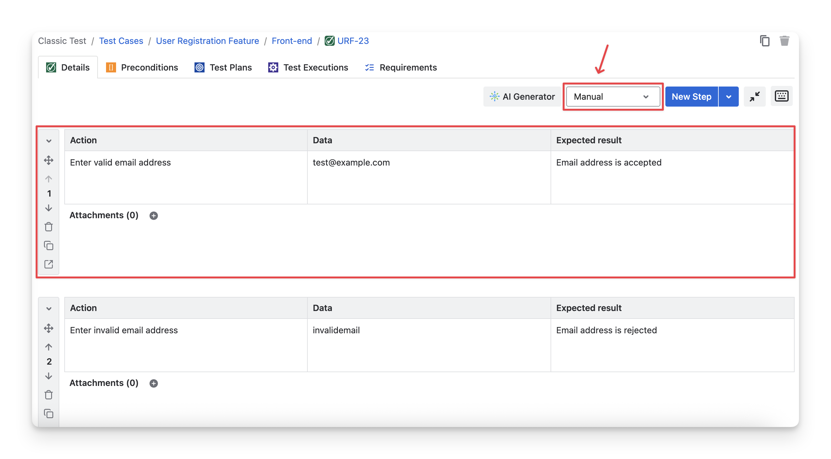You can create and edit test steps here to define a clear sequence of actions used to verify the test case.