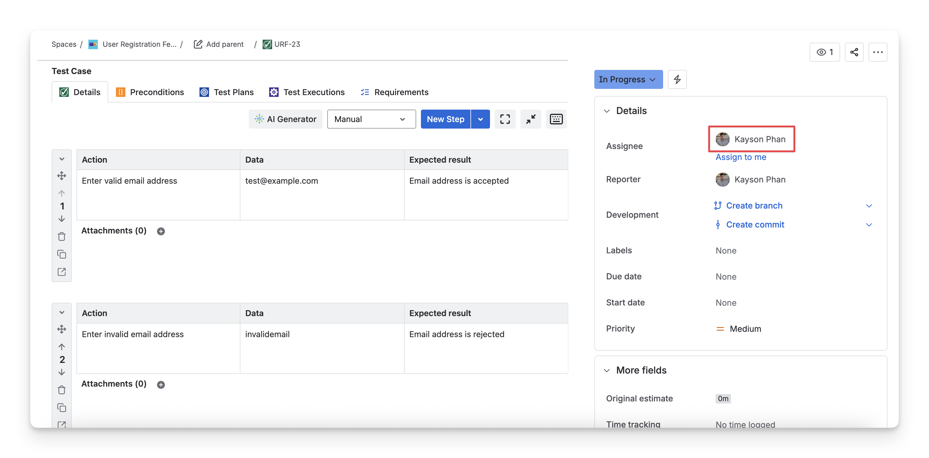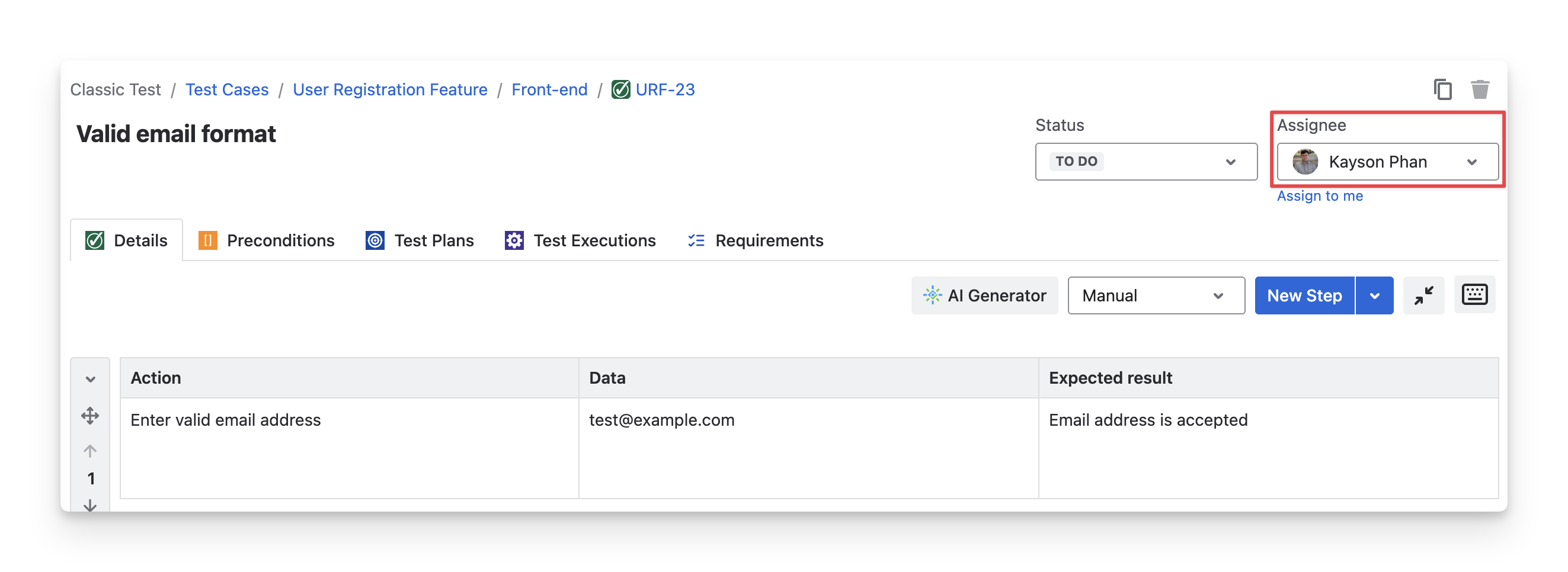 The Assignee box shows who is responsible for this test case. To change the assignee, click the dropdown and select a team member.