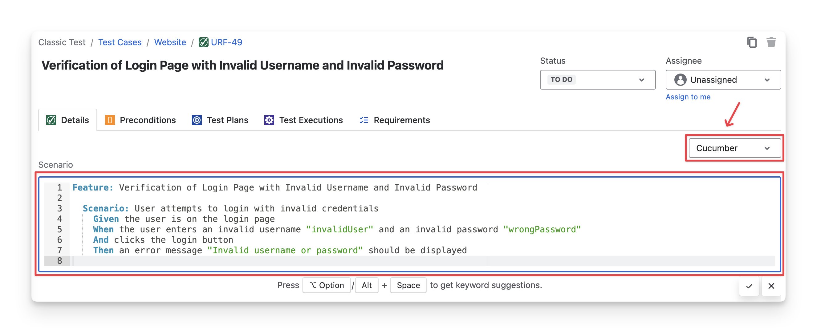 For Cucumber test cases, the Details tab displays a structured text area for writing tests in Gherkin format. You can define and edit scenarios using Given – When – Then steps.