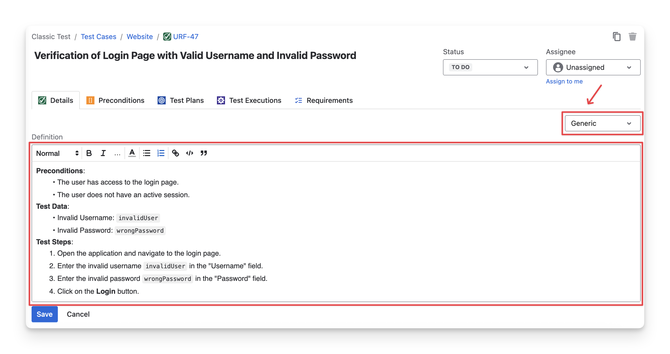 For Generic test cases, the Details tab provides a simple text area where you can freely describe the test. You can document the test scenario, checks, or notes in your own notes for these test cases.