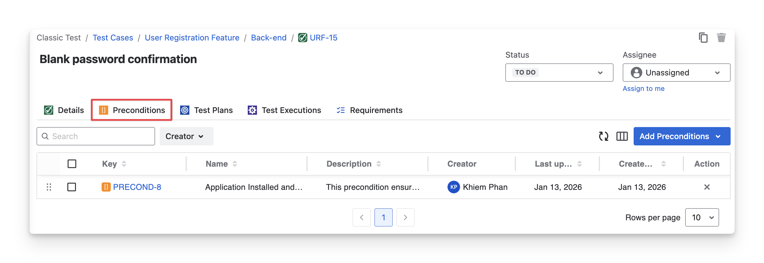In the Preconditions tab, you can check which preconditions have been linked with this test case. This ensures that you are aware of the defined conditions and execute the test case under the correct setup.