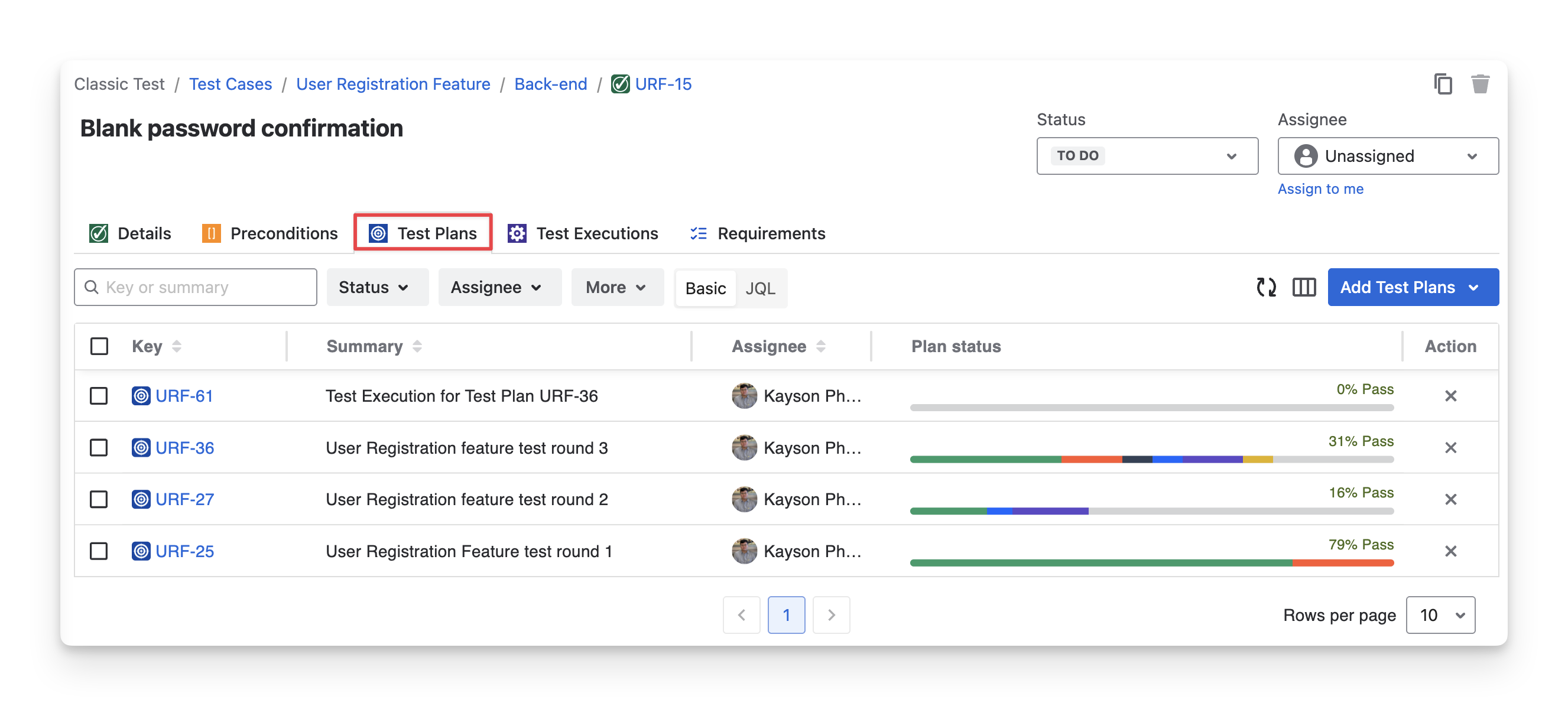 Filter, search, and view which test plans the test cases are associated with