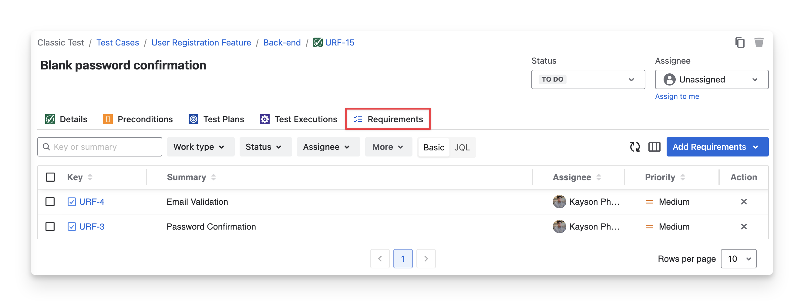 Filter, search, and view which requirements the test cases are associated with