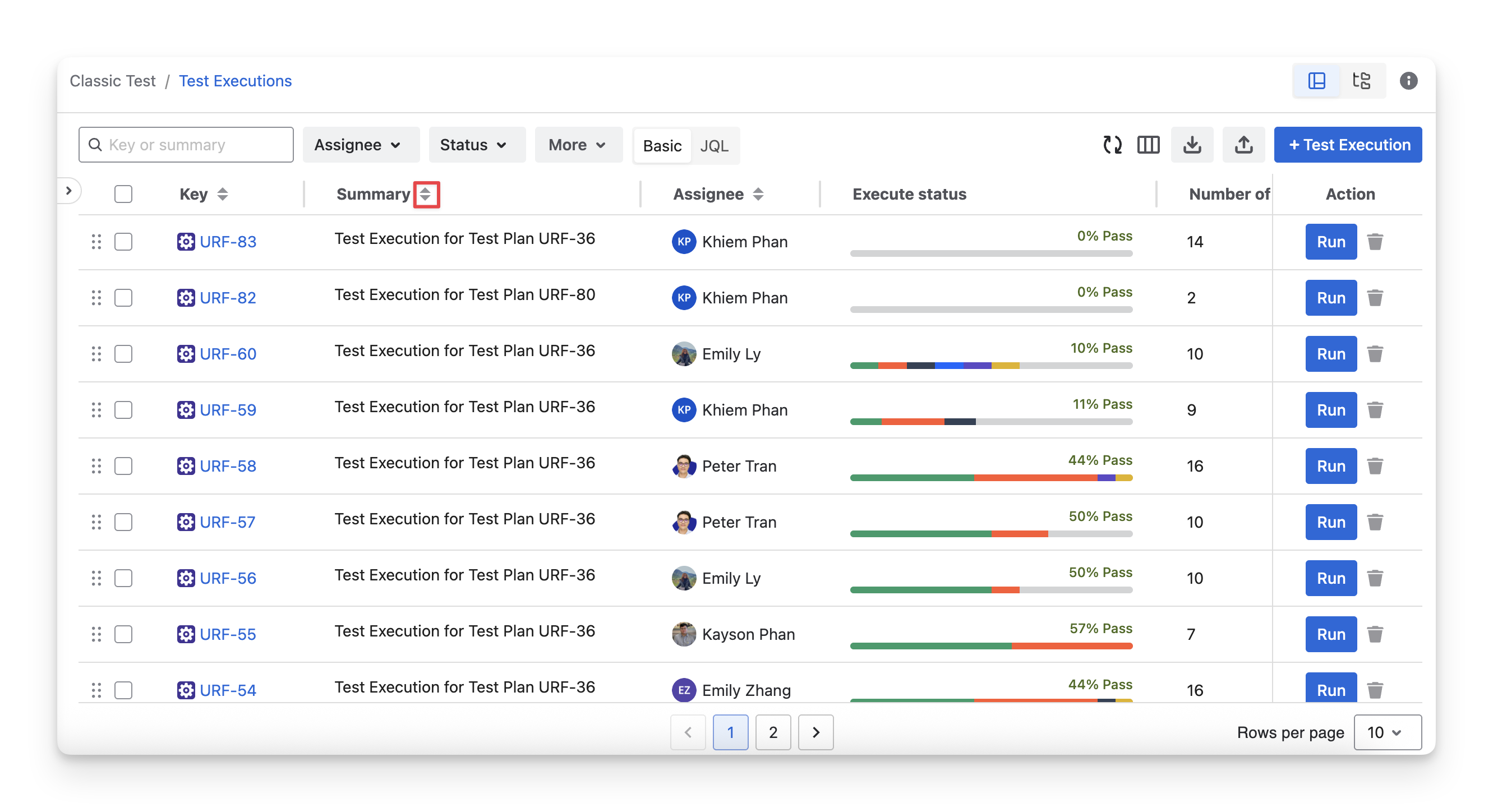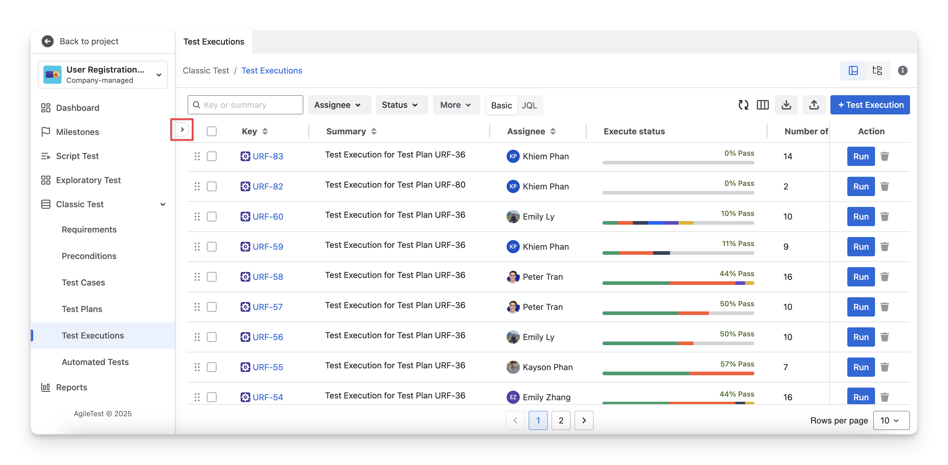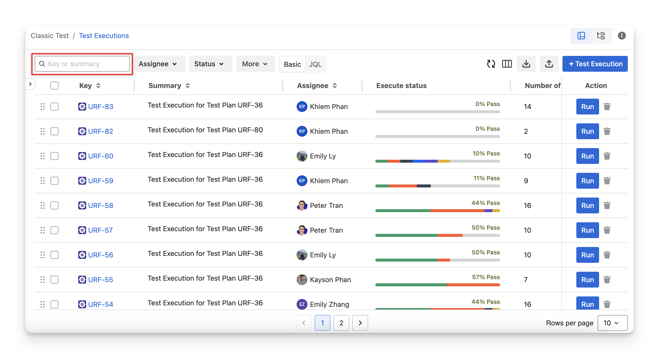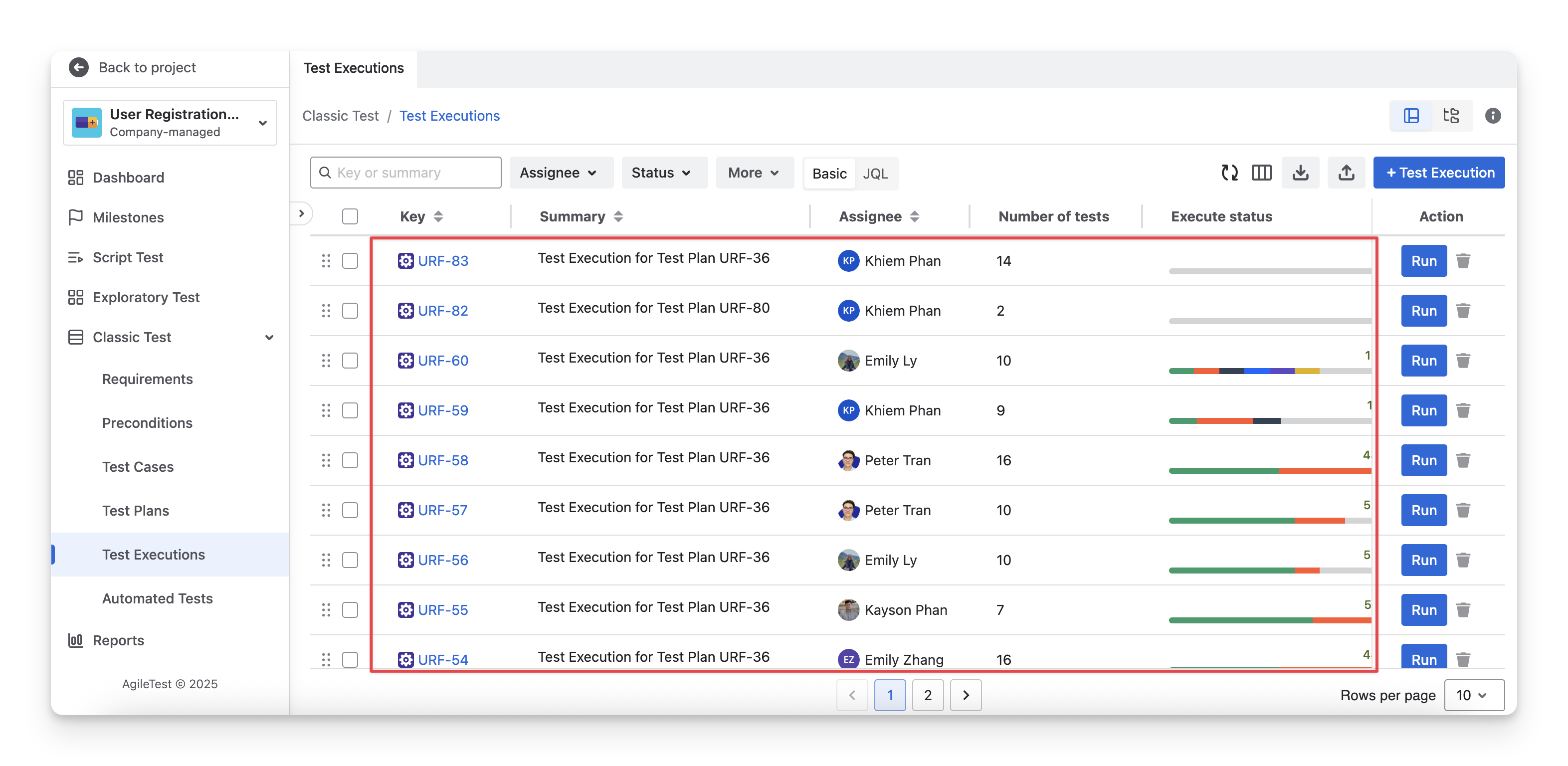 In the Test Execution screen, you can see a list of test executions with key data: