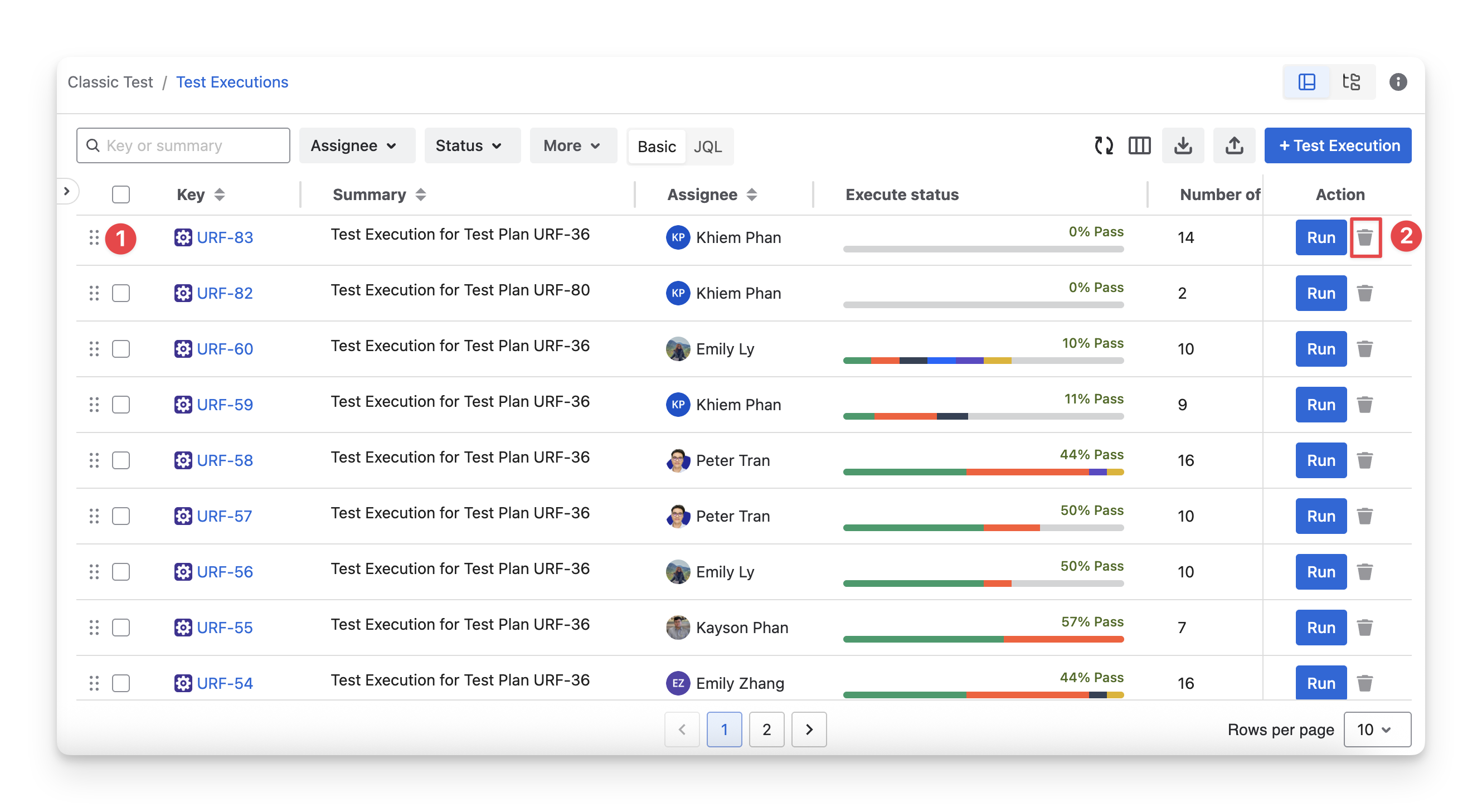 To delete a test execution, follow these steps: