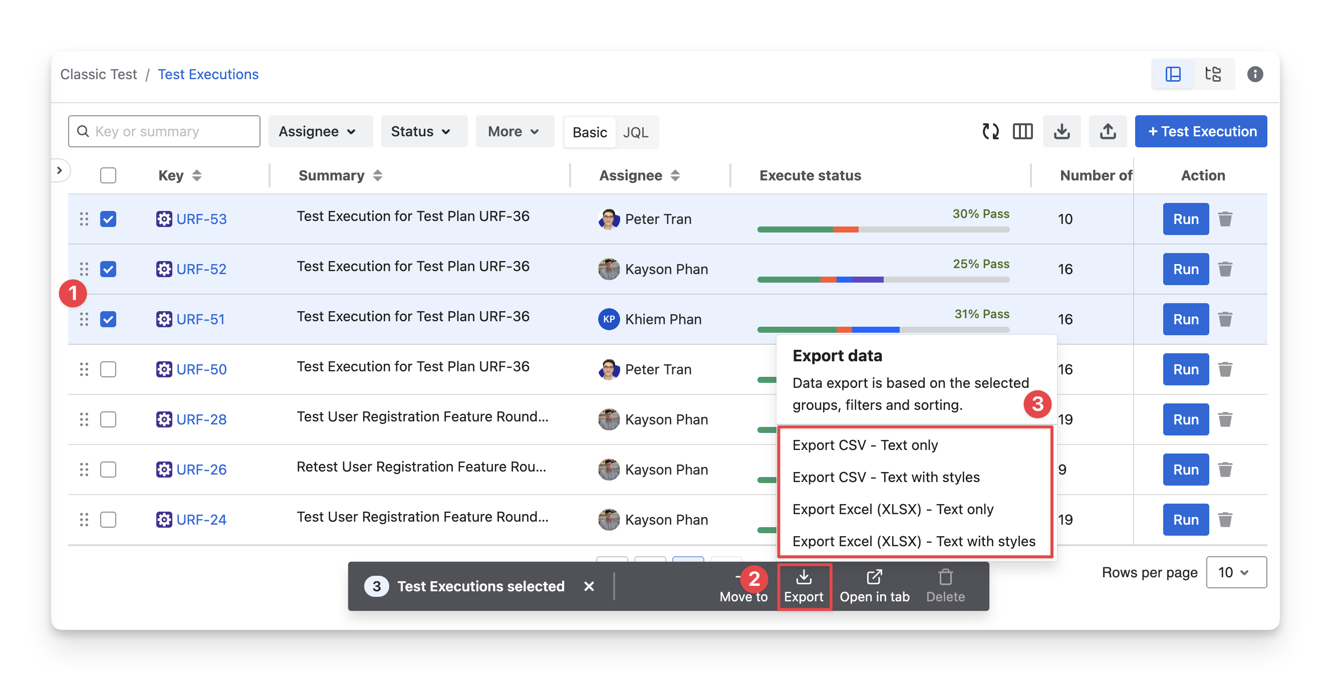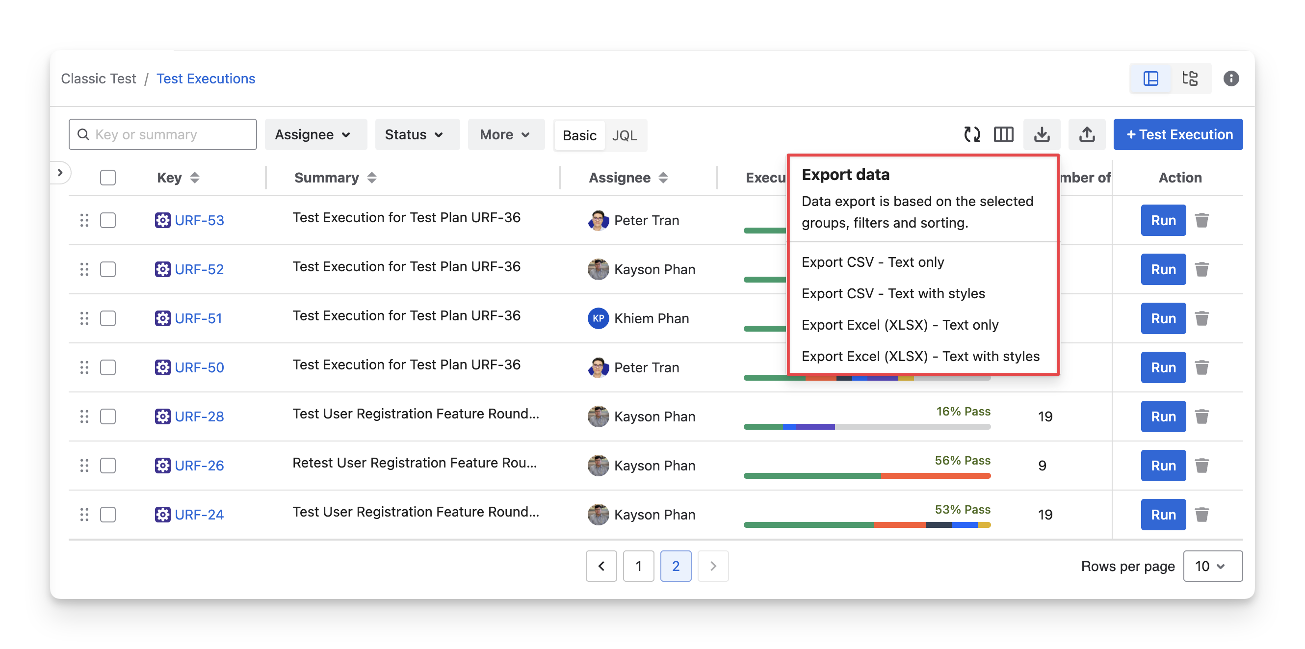 CSV Text With Styles: Download test executions in a CSV format that includes basic styling, such as color or bold text, to make the data easier to read when opened in spreadsheet software.