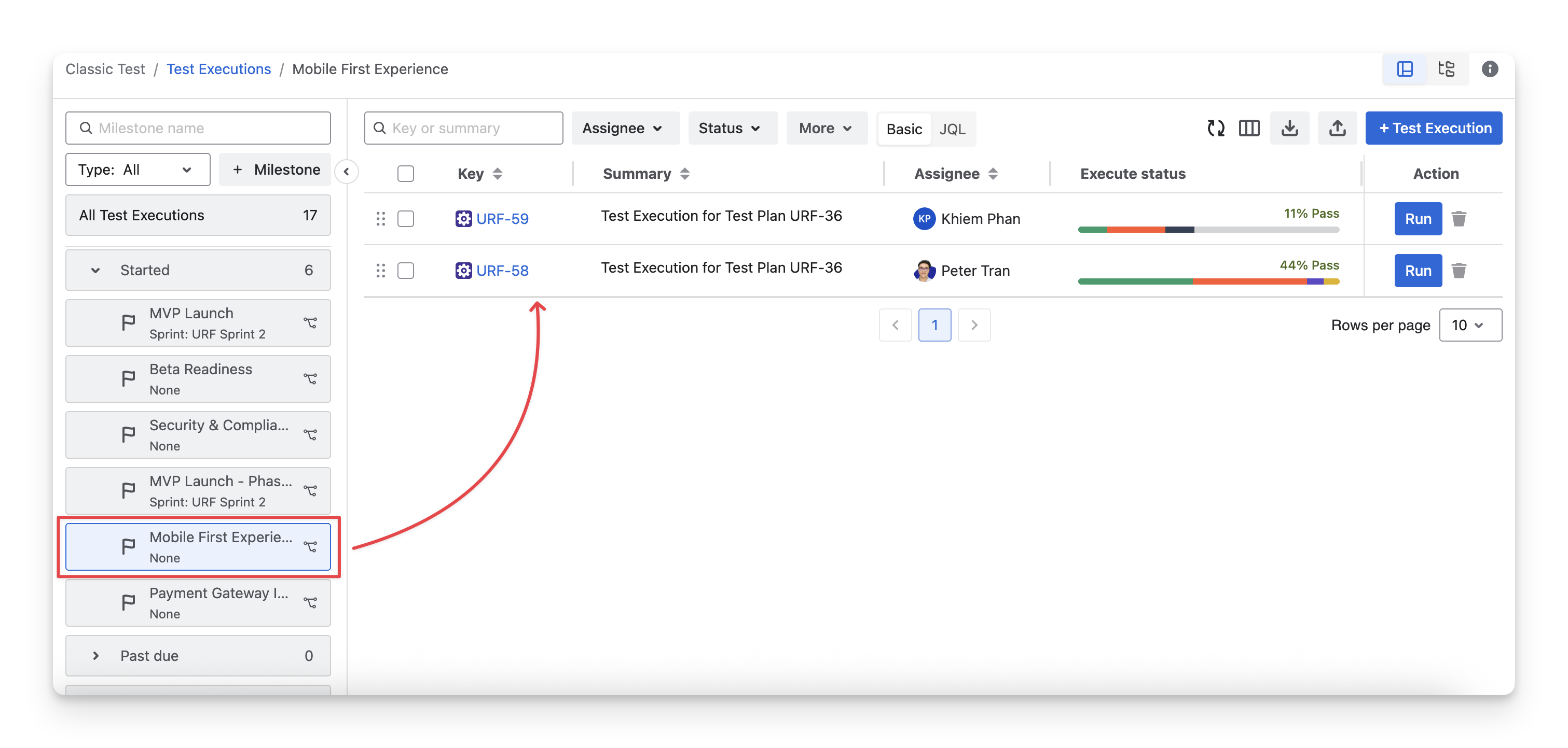 When you choose a specific milestone in this dropdown menu, you can see the linked test executions of this milestone.