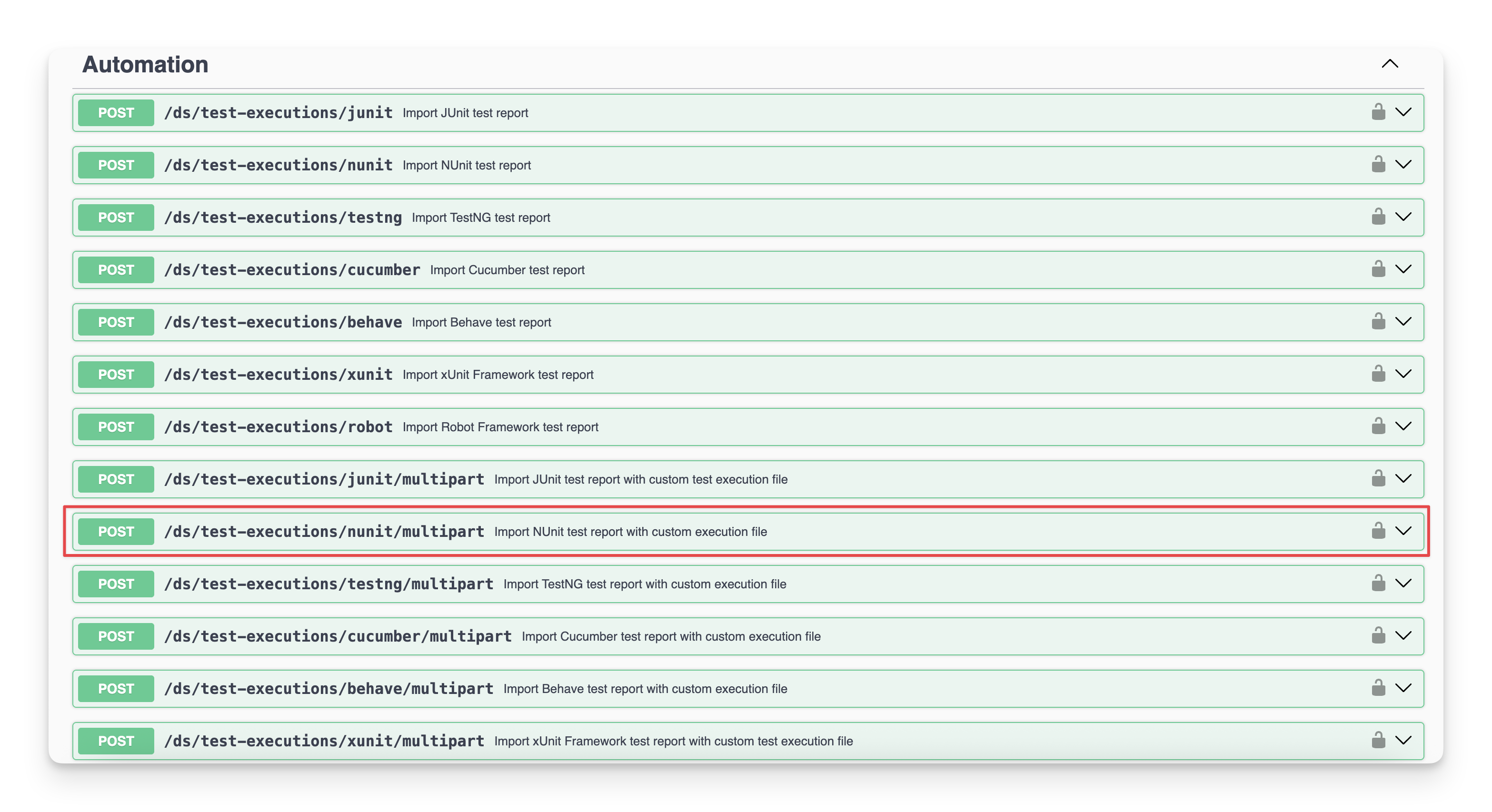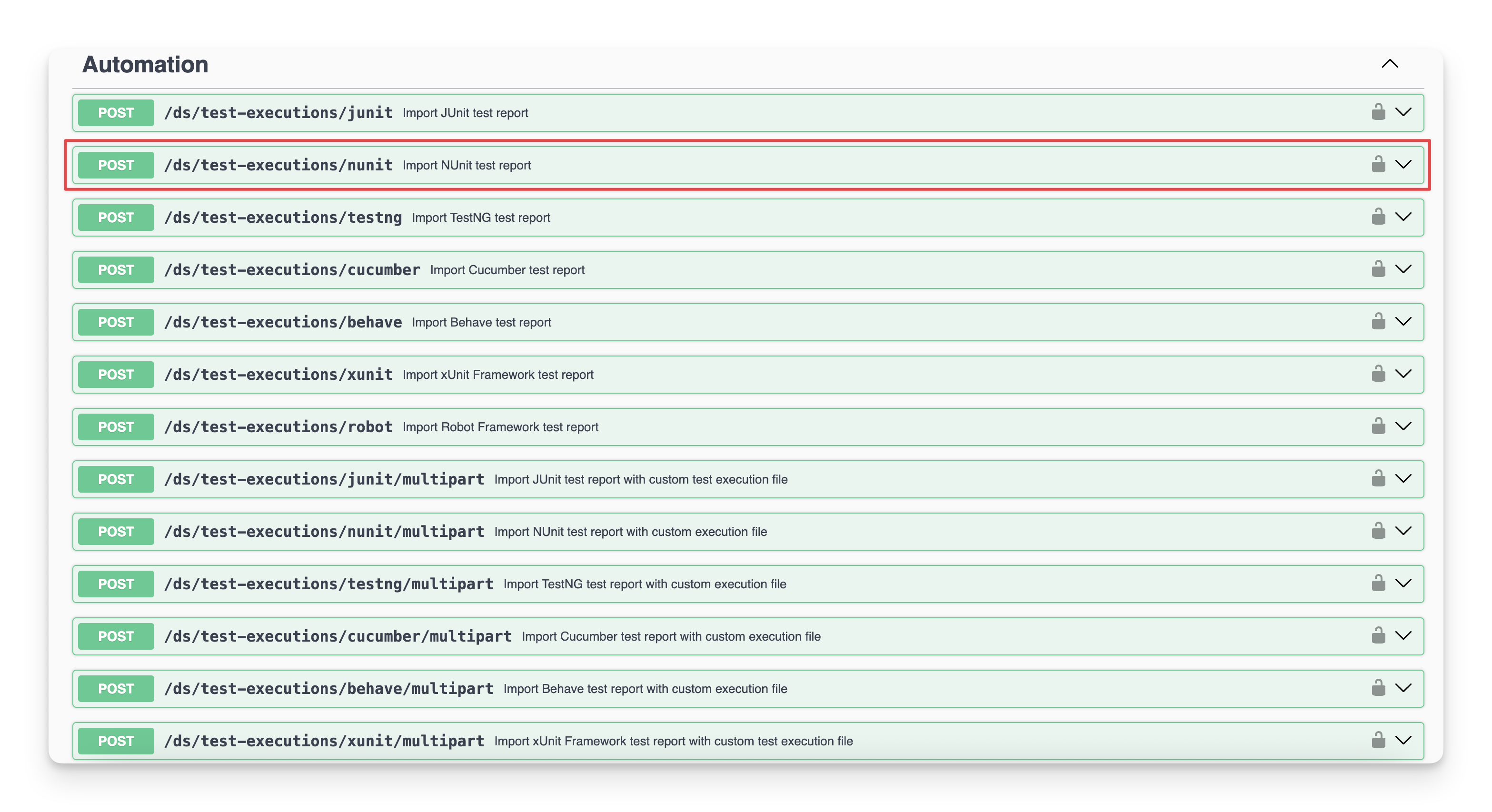 You can locate the endpoint at the POST/ds/test-executions/nunit in the API document.