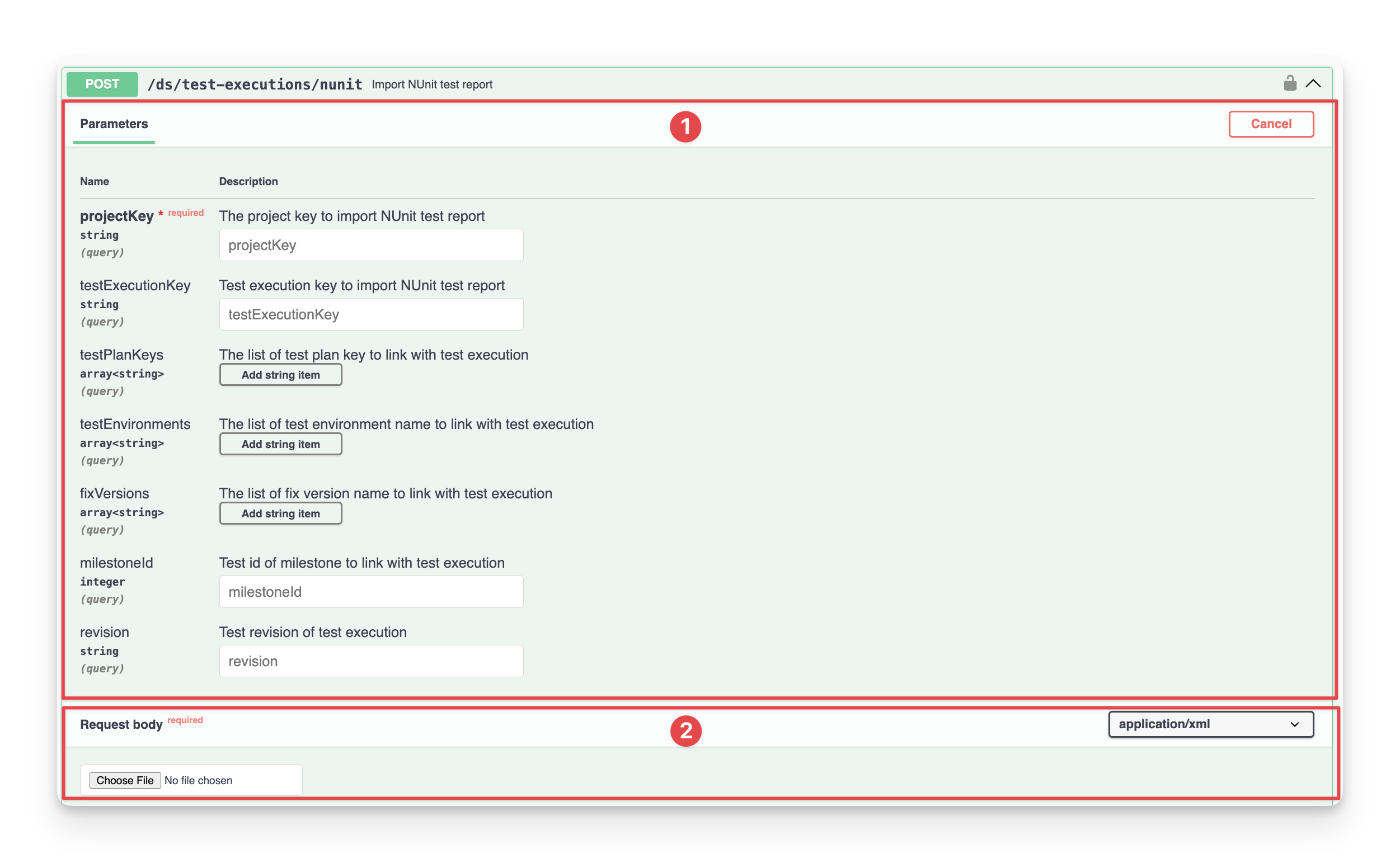 Request body: where you can input an XML file, which is a NUnit report that is going to be imported.