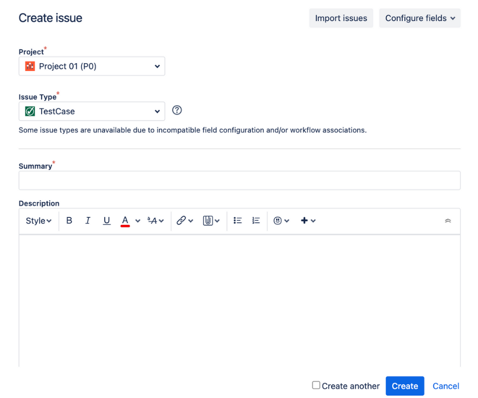 If you chose New test case, a Create issue dialog shown up, fill in all the necessary and click on Create button