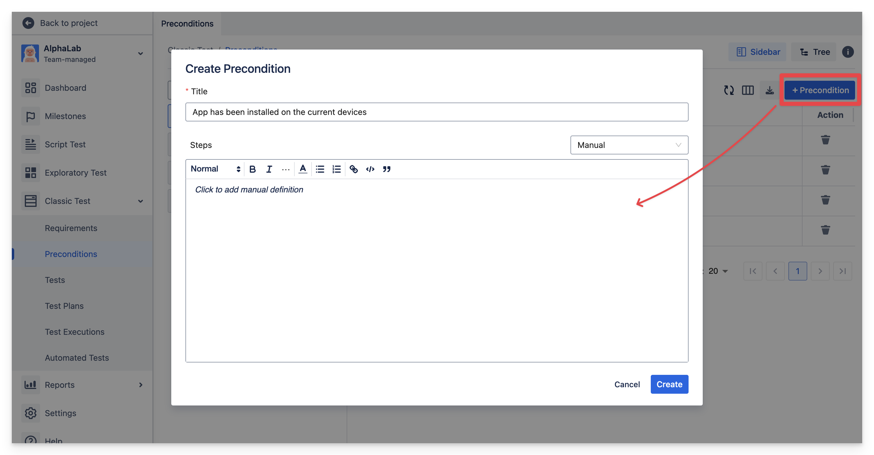 In order to manage preconditions of a specific project, navigate to Test Management → Preconditions.