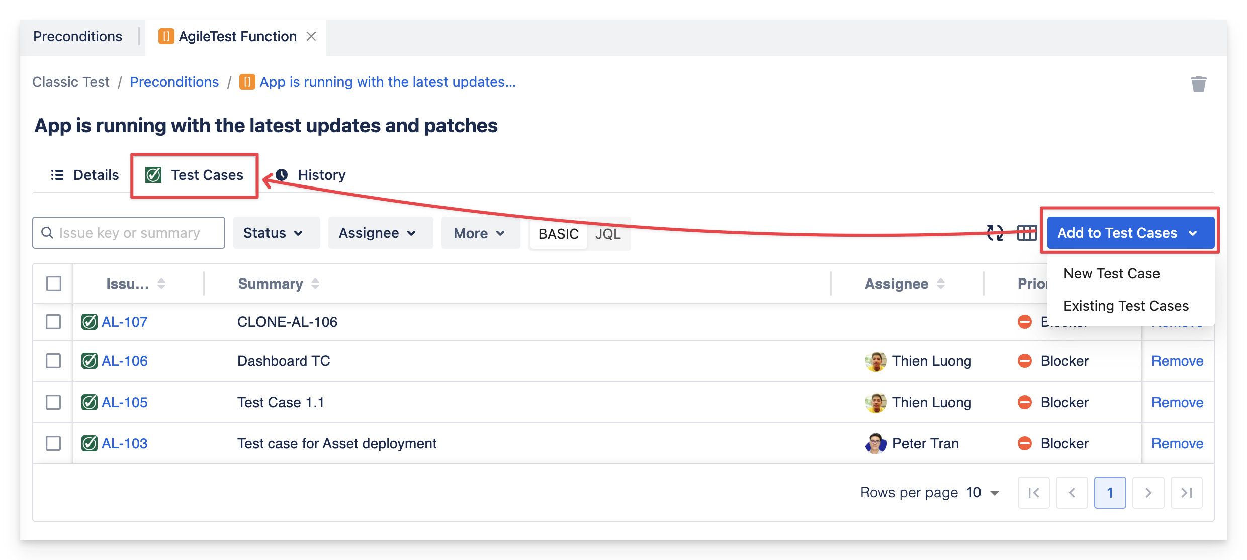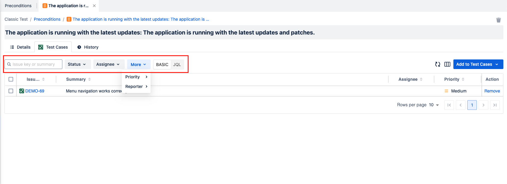 In the associated test case list, you can search test cases by summary or issue key, assignee, status, priority, and reporter.