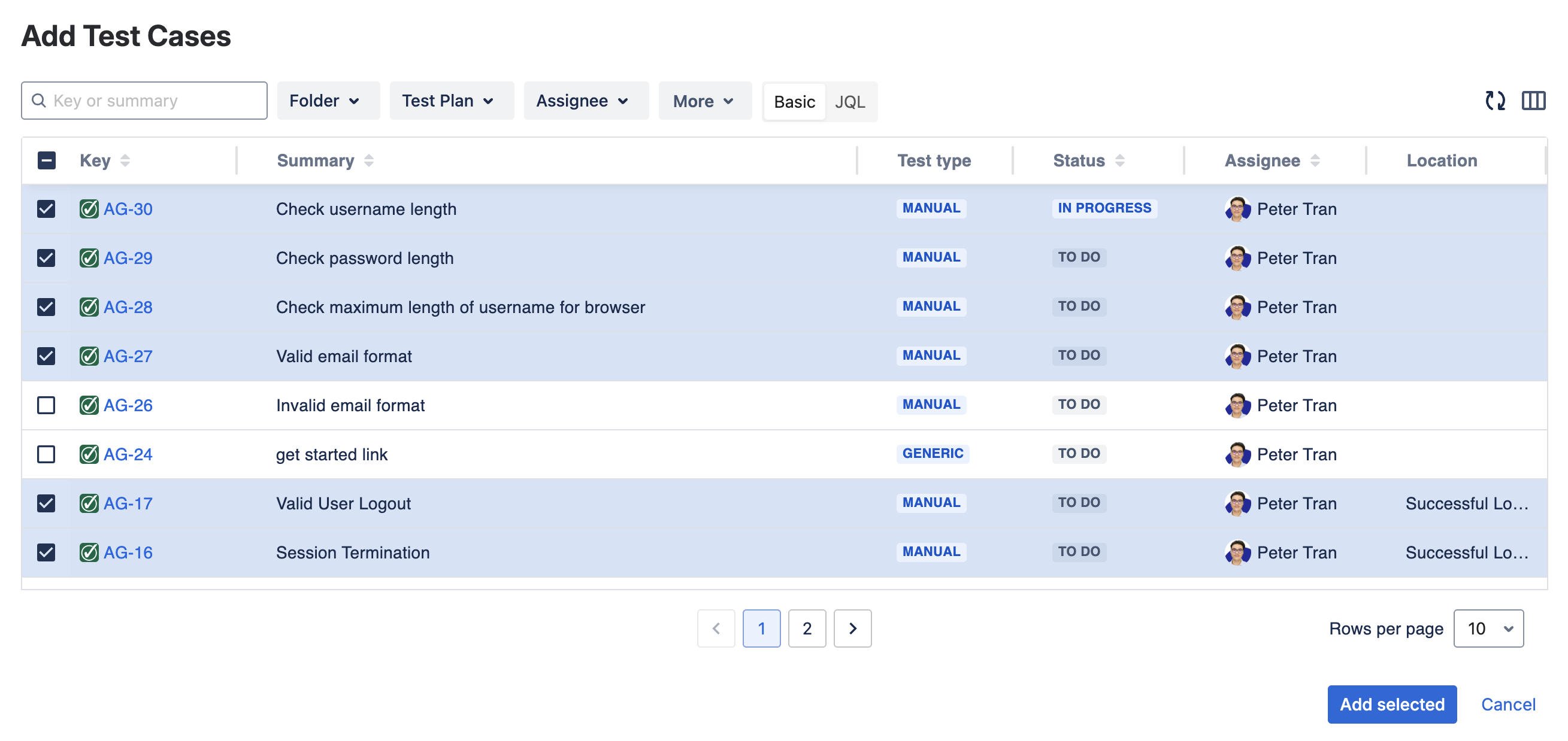 If you choose Existing test cases, you can select test cases by searching by name, filter by fields and conditions, or using JQL. Then click on Add Selected button