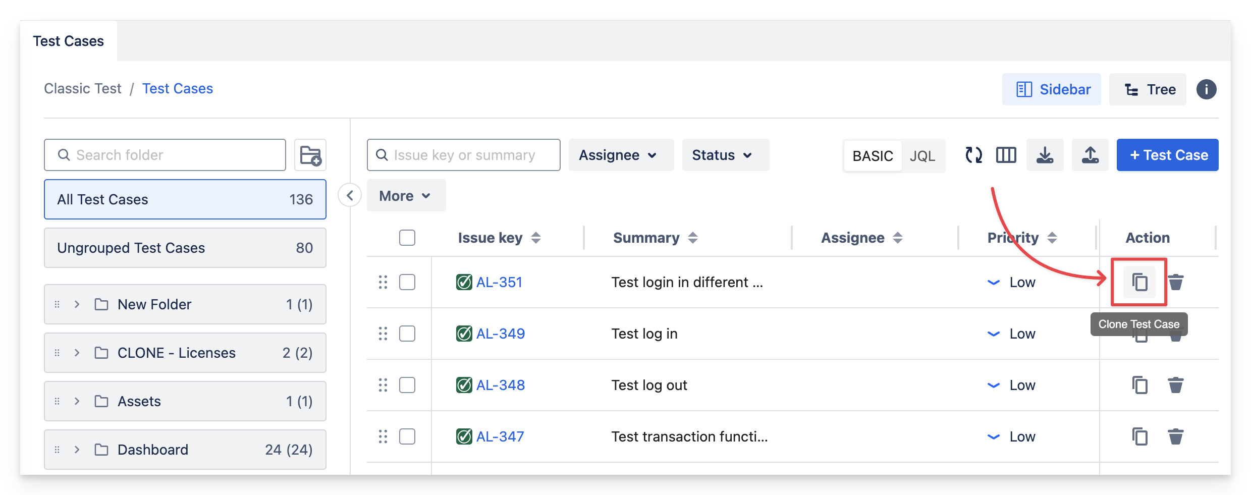 In order to manage test cases of a project, navigate to Classic Test → Tests.