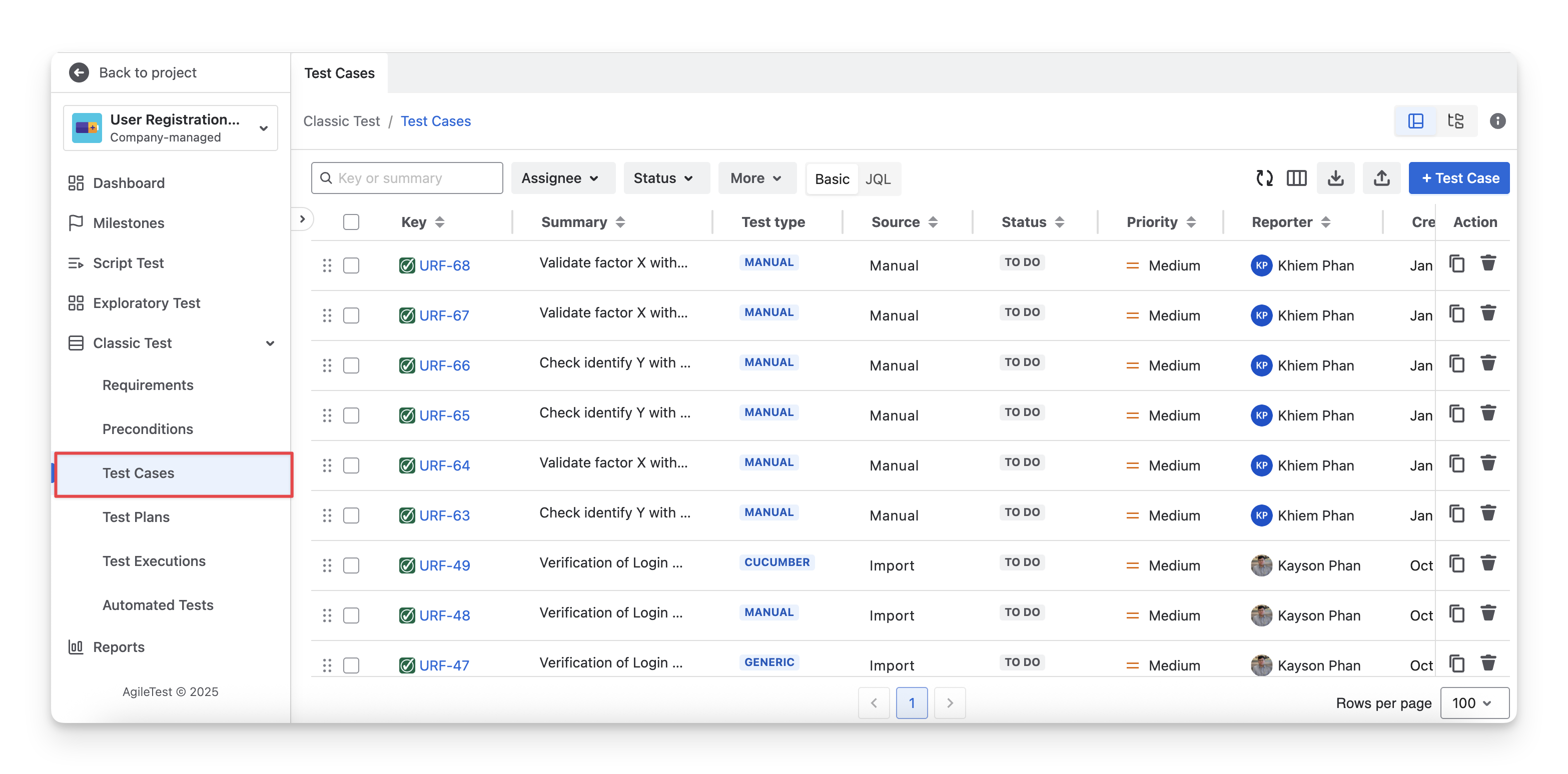 To view test cases in AgileTest, navigate to the Classic Test section on the left menu sidebar → Choose Test Cases.