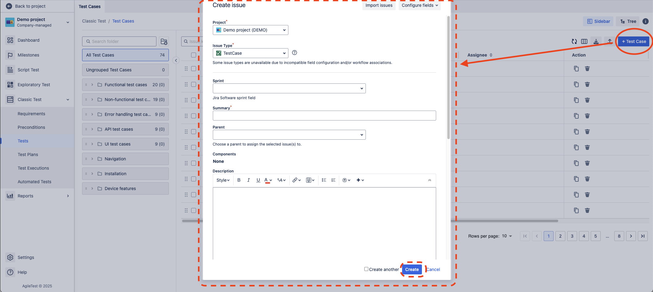 Fill in all desired fields of the new Test case in Jira issue dialog