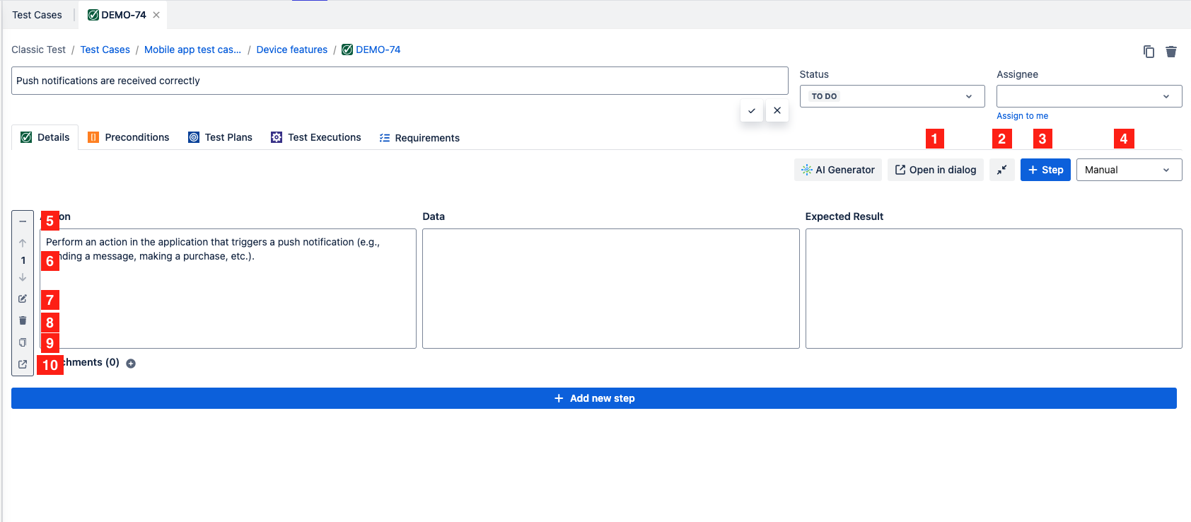 In the Test Details tab, you can find all the information related to the test steps. Additionally, you can manage your test steps within this screen by performing the following actions:
