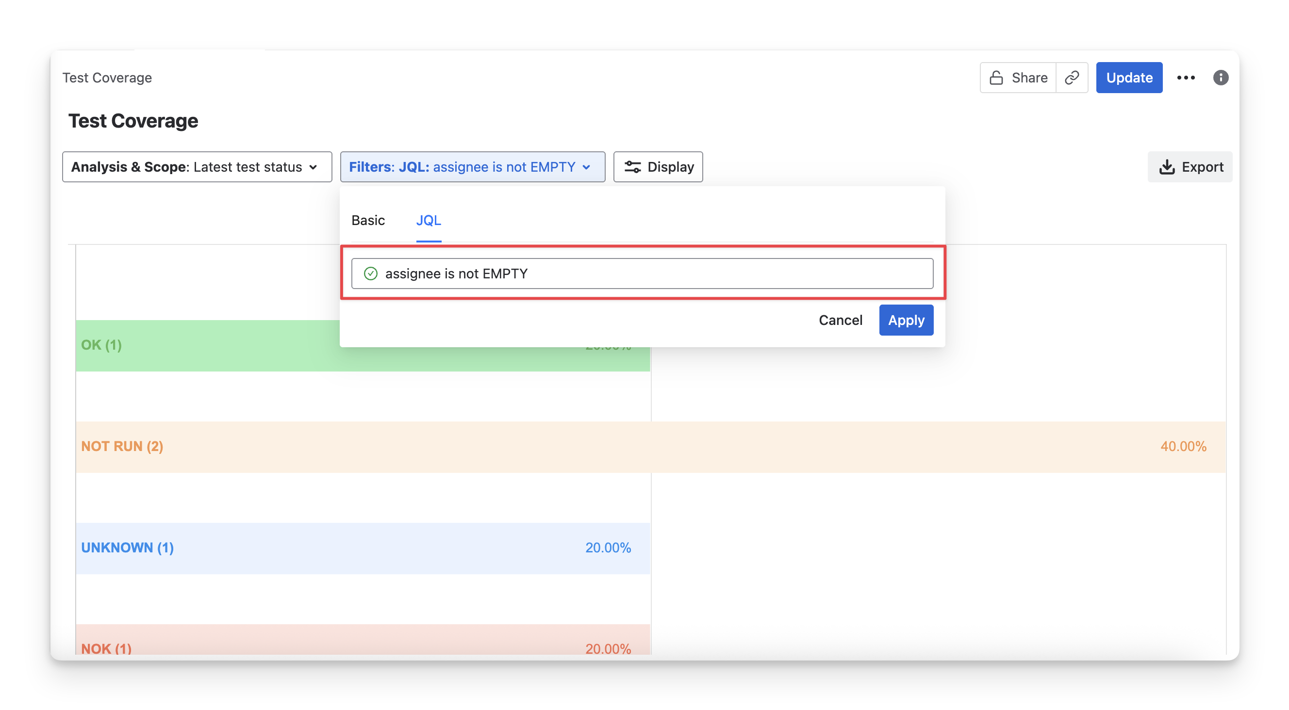 The Test Coverage Chart displays the status of your requirements as a percentage of the total requirements in scope. Each status is calculated based on the execution results of the test cases linked to those requirements, under the coverage analysis process.