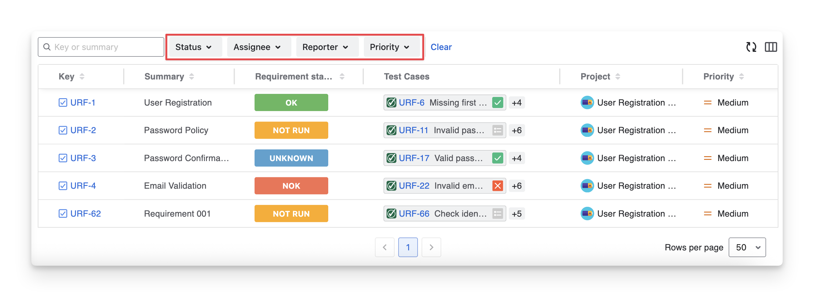 Status: Filter requirements based on their calculated coverage status (NOK; NOT RUN; UNKNOWN; OK; UNCOVERED)