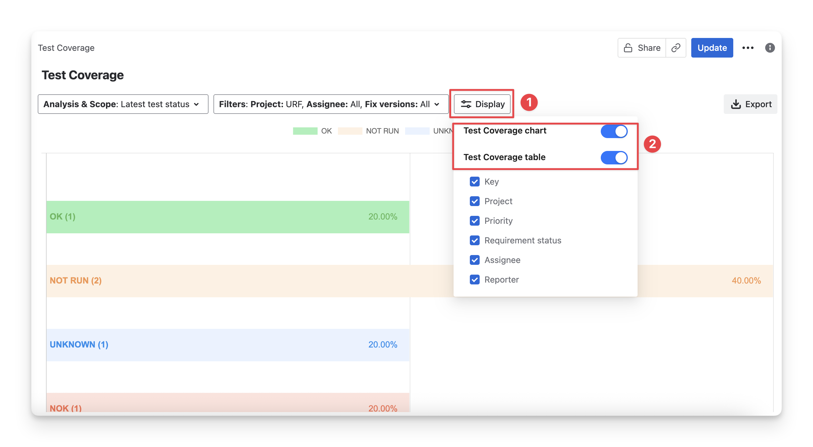 From there, you can turn on/off the switches to show or hide the whole Test Coverage chart and table section.