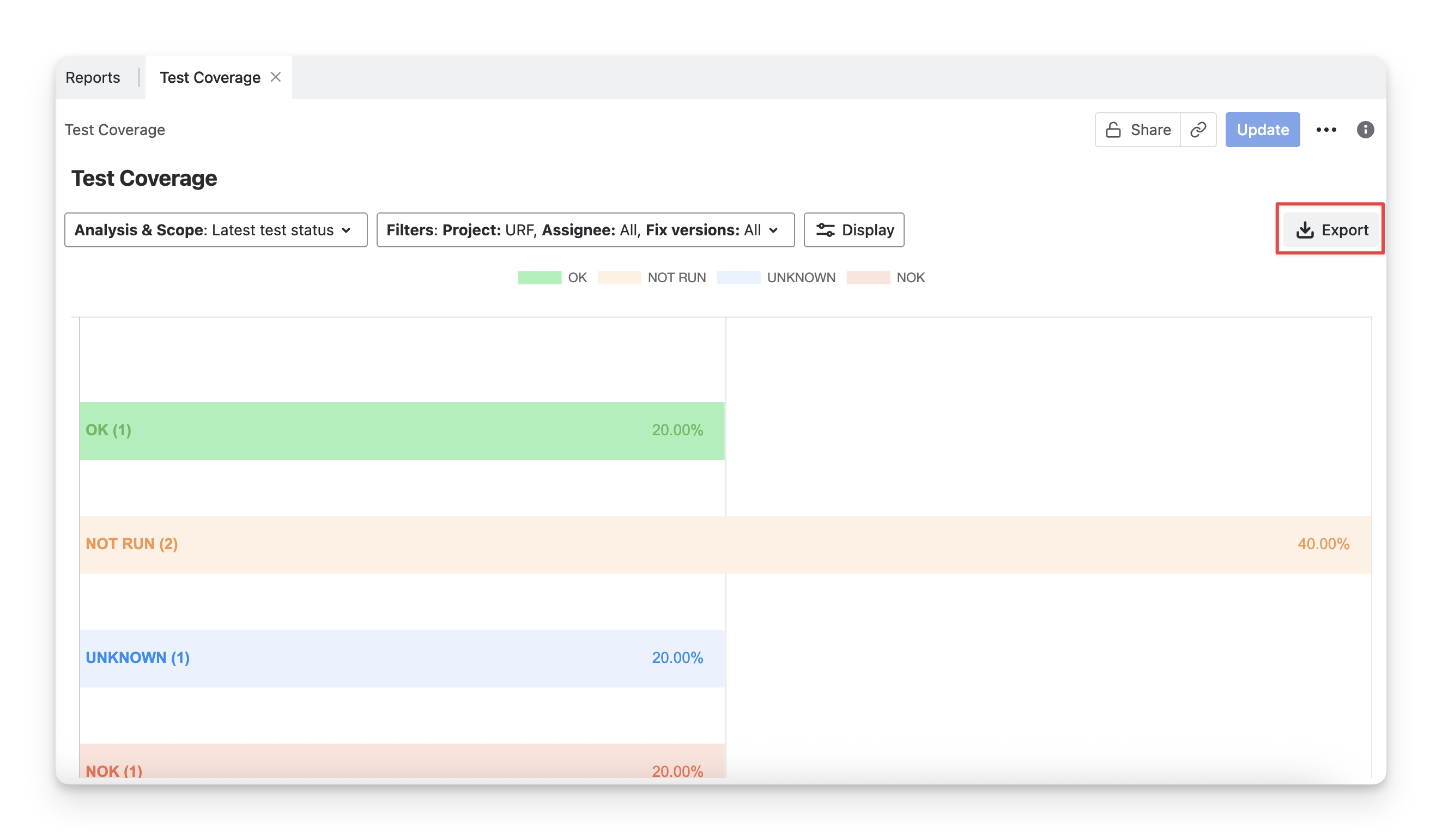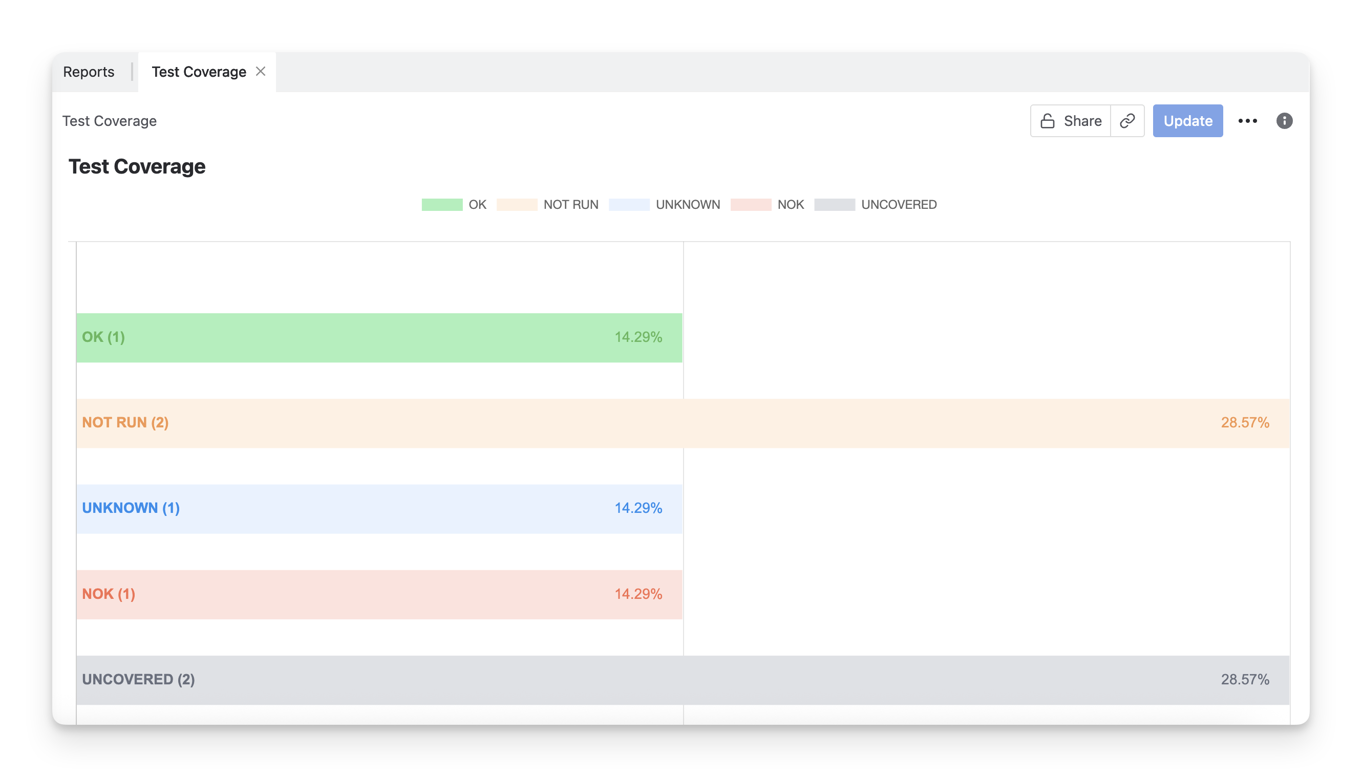 Test Coverage Chart: A bar chart that shows the distribution of requirement statuses. Each bar represents a requirement status, and its length indicates the percentage of the total requirements that fall into that status.