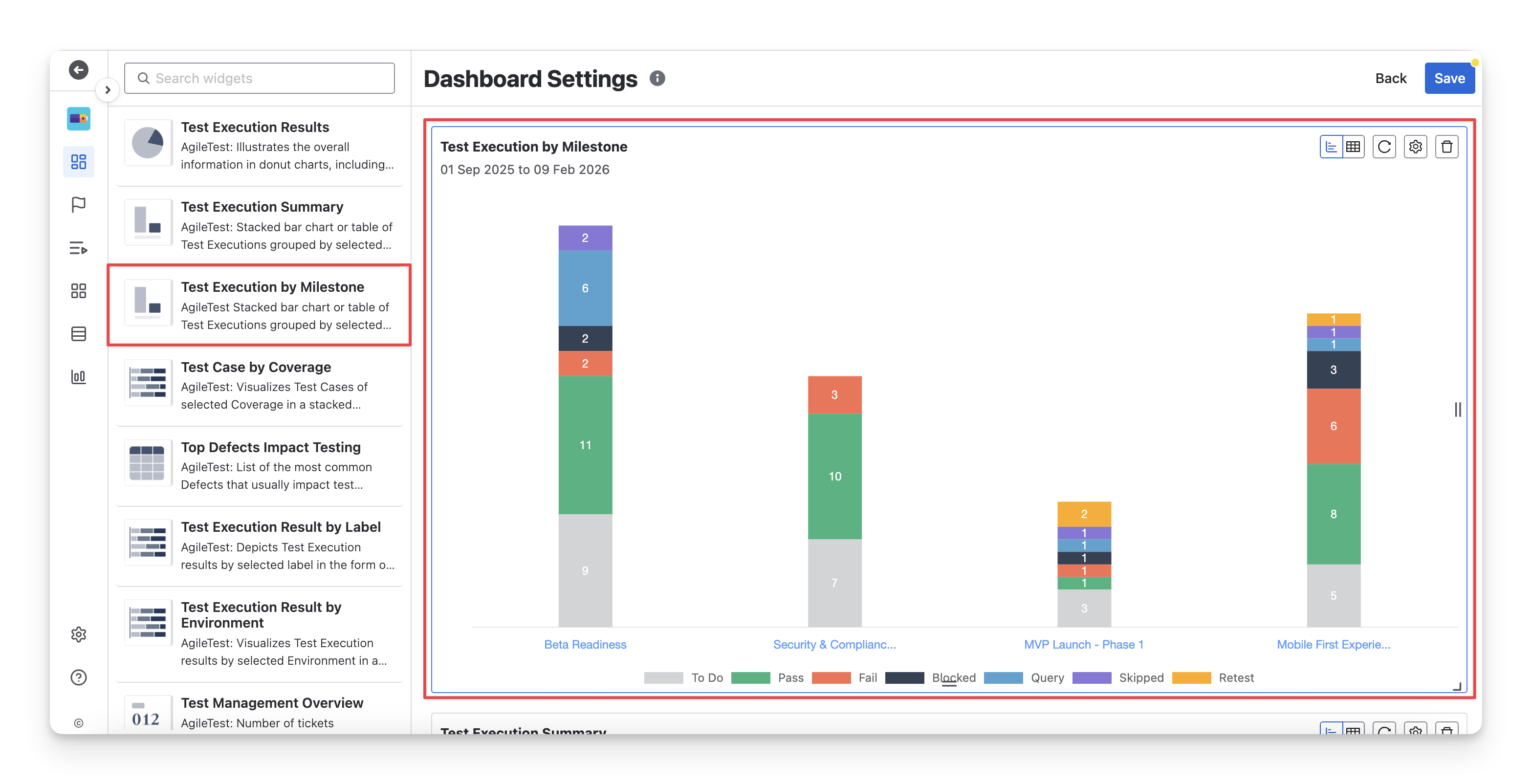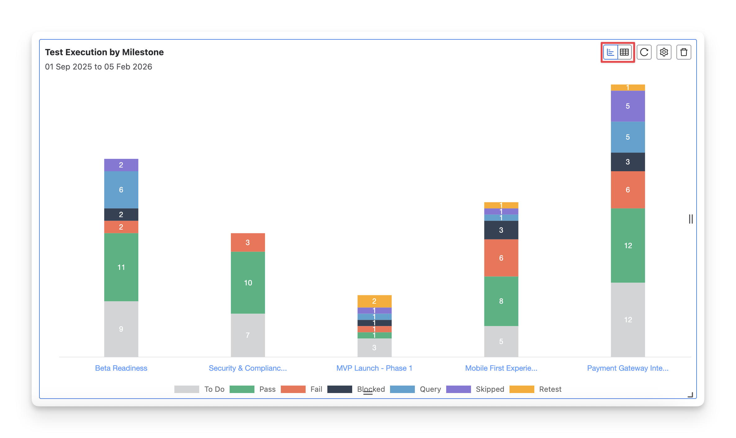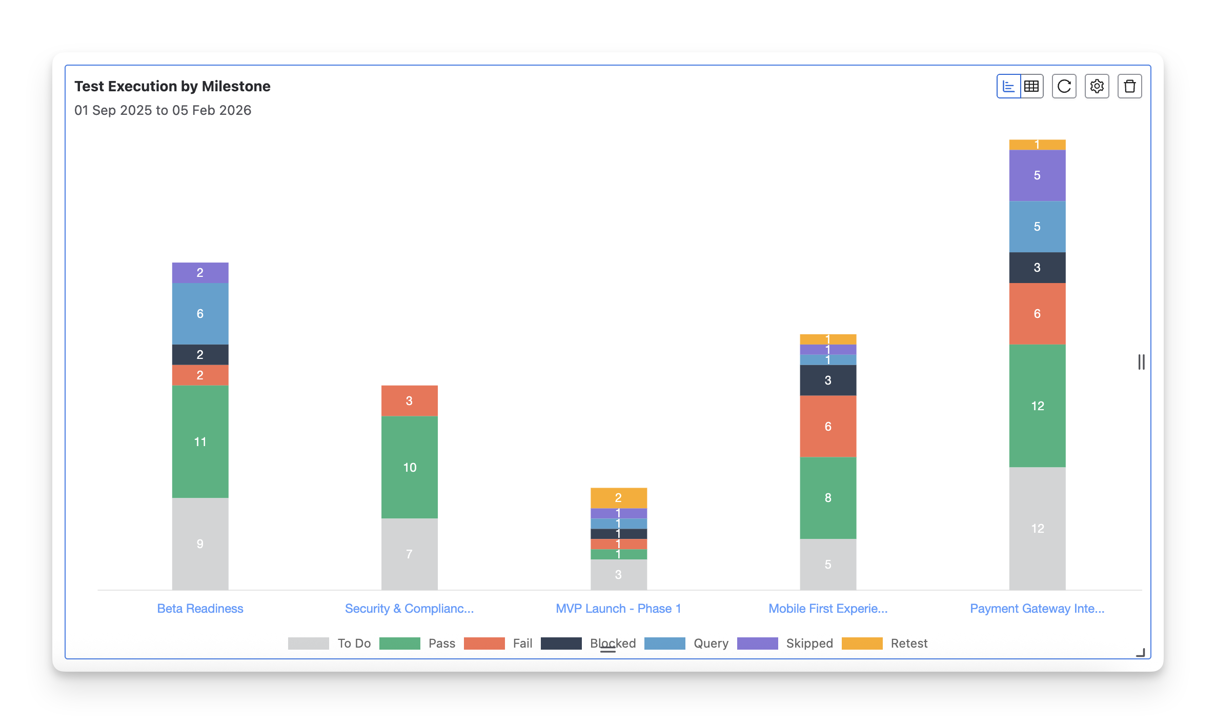 The Test Execution by Milestone chart is ideal for QA teams who need to:
