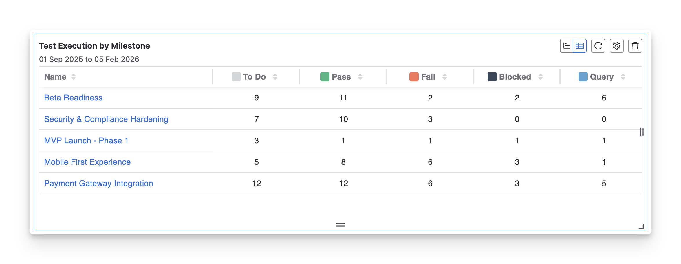 Compare execution progress across multiple milestones: The table format makes it easy to compare test execution across different milestones, helping teams ensure that progress is consistent and identify if one area needs more focus.