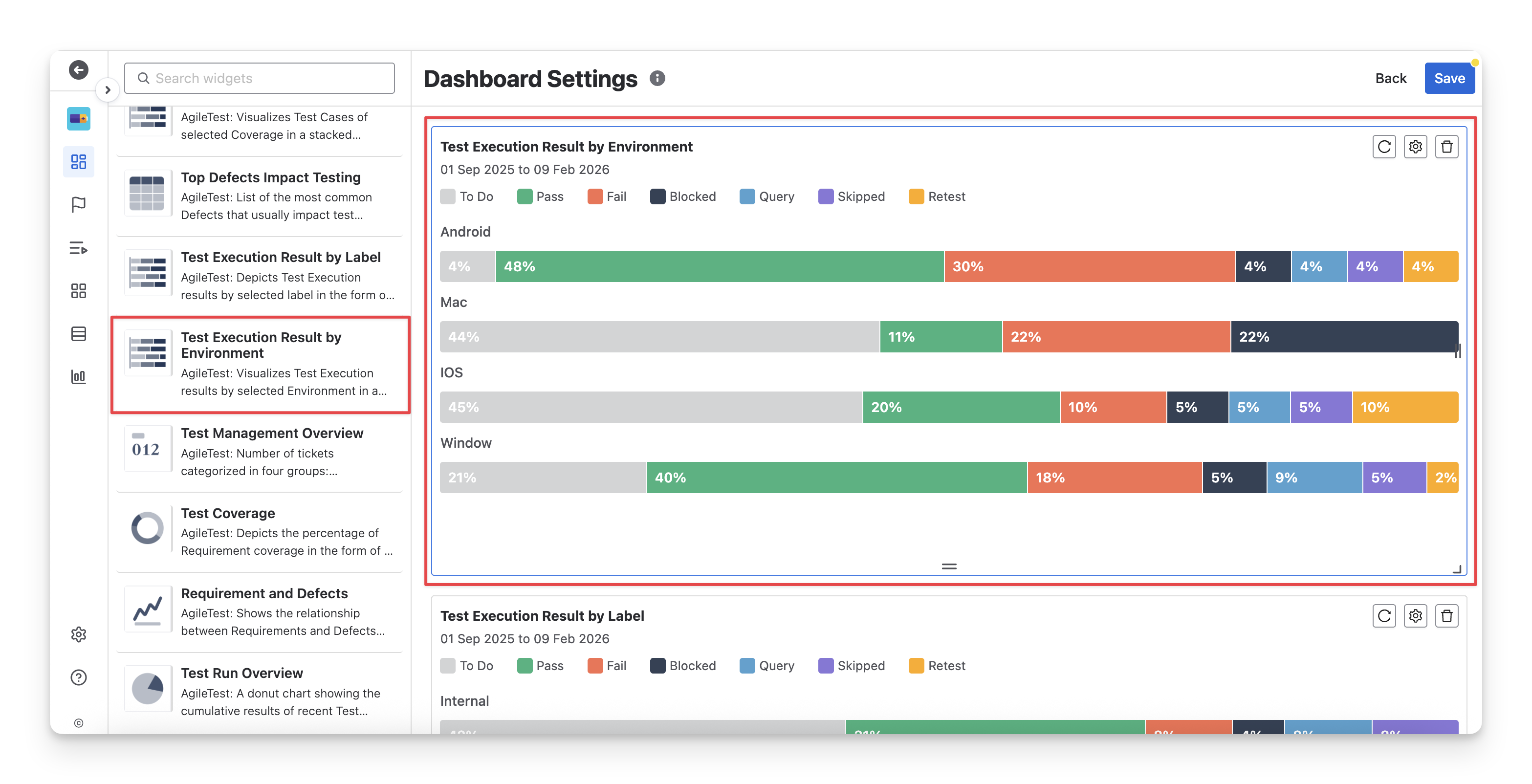 The Test Execution Result by Environment widget is useful for QA teams when they need to track the execution status of tests across different environments in Jira. This widget shows the percentage of test executions in various statuses (FAIL PASS SKIPPED BLOCKED QUERY TODO RETEST) for each environment, helping teams identify which environments are experiencing issues or delays. You can make use of this widget to: