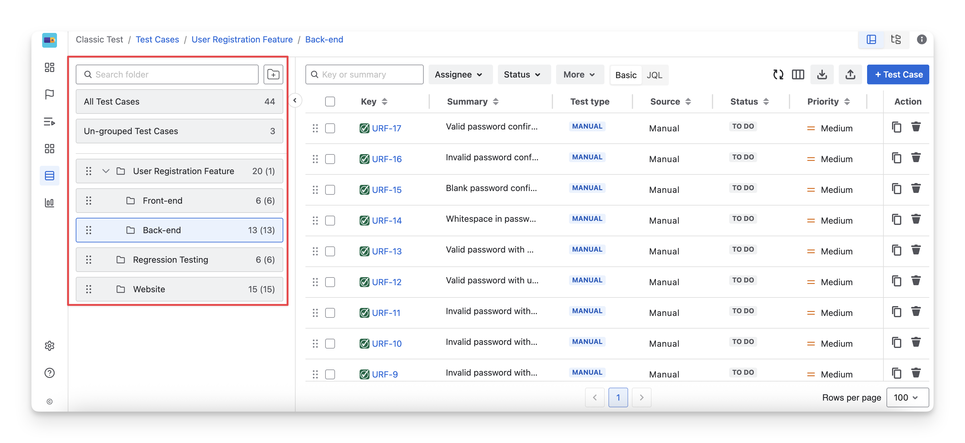 To view Requirement Folders, navigate to the Test Cases section inside the Classic Test on the left-hand side menu bar. You will see the list of test case folders displayed in the folder panel.