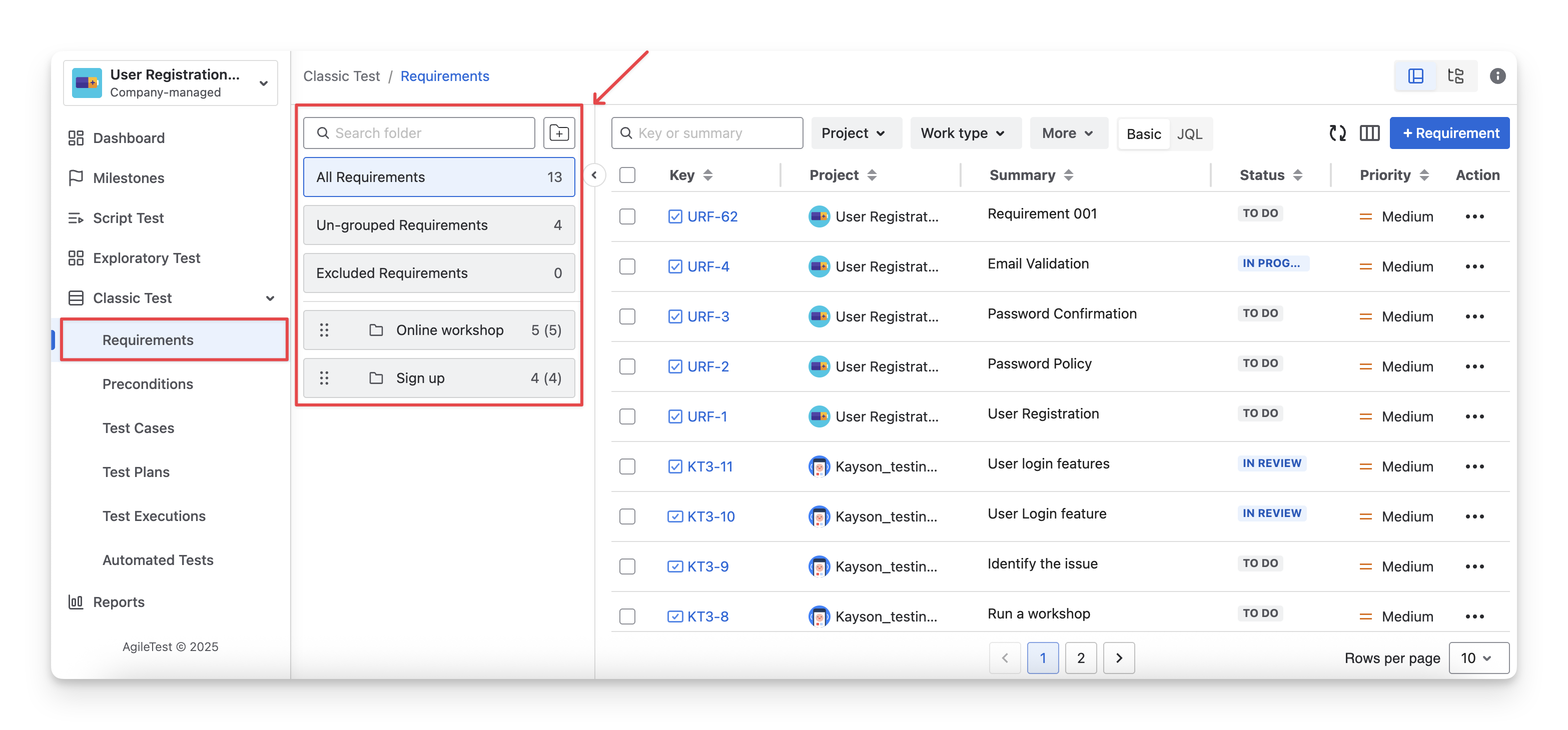 To view Requirement Folders, navigate to the Requirements section inside the Classic Test on the left-hand side menu bar. You will see the list of requirement folders displayed in the folder panel.
