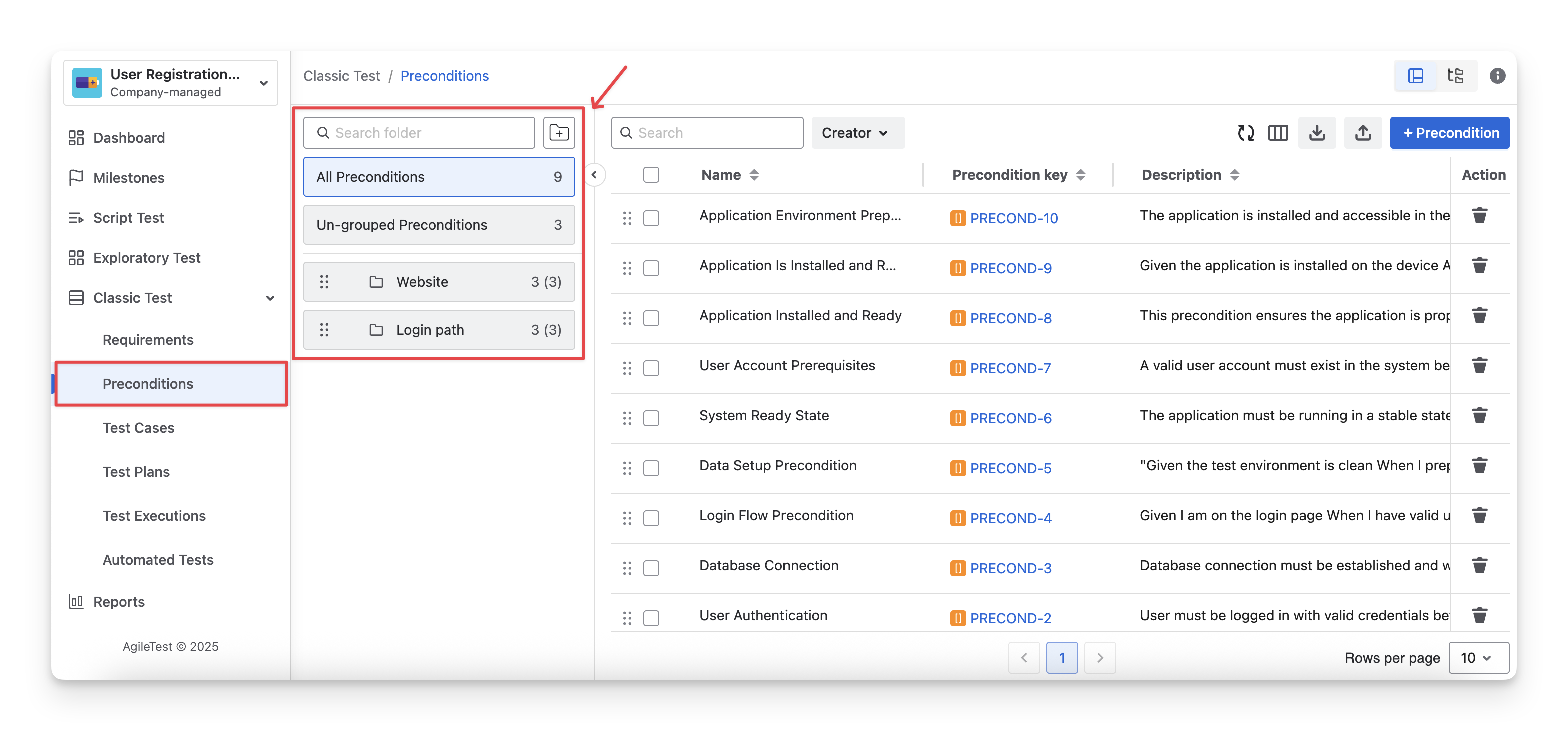 To view Precondition Folders, navigate to the Preconditions section inside the Classic Test on the left-hand side menu bar. You will see the list of precondition folders displayed in the folder panel.