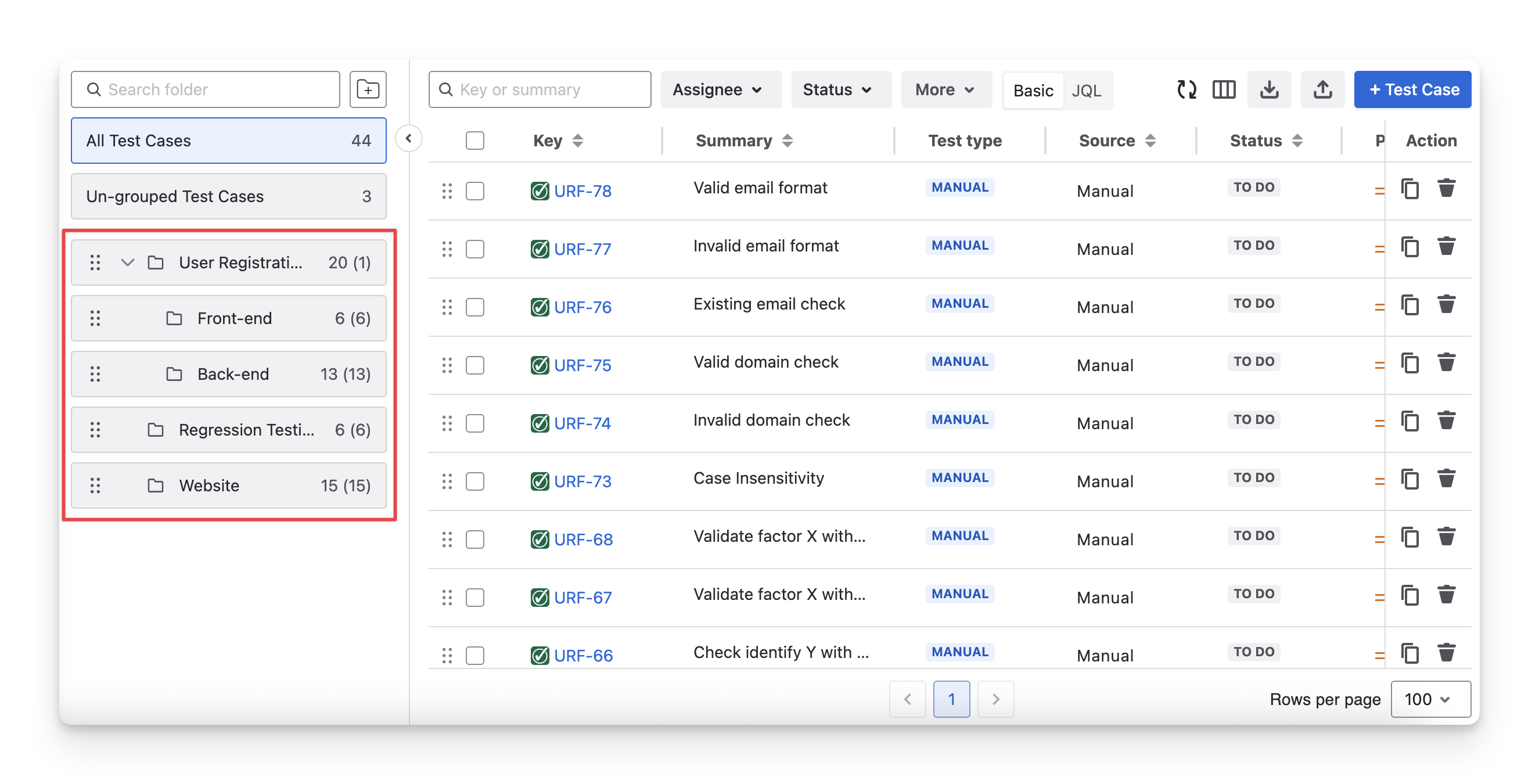 Review or organize test cases across multiple folders