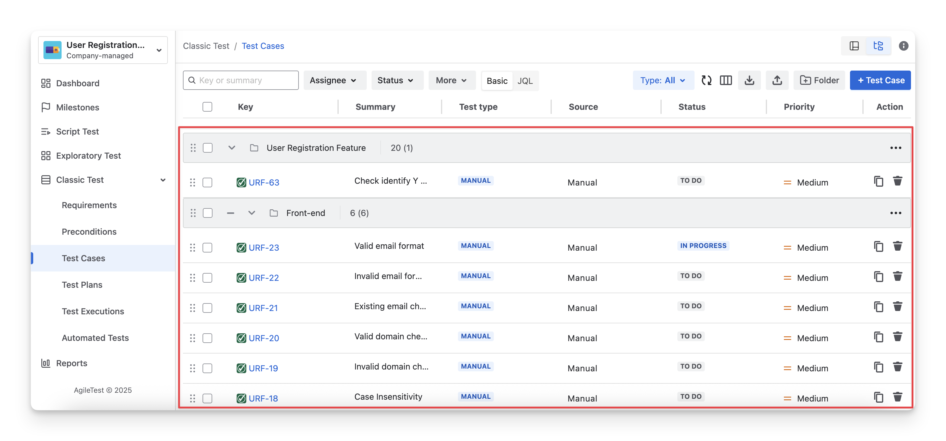 Test folders in AgileTest help you organize requirements, preconditions, and test cases into logical groups, making them easier to find, manage, and maintain. By using folders and subfolders, QA teams can keep related testing items together and maintain a clear structure as the number of tests grows.