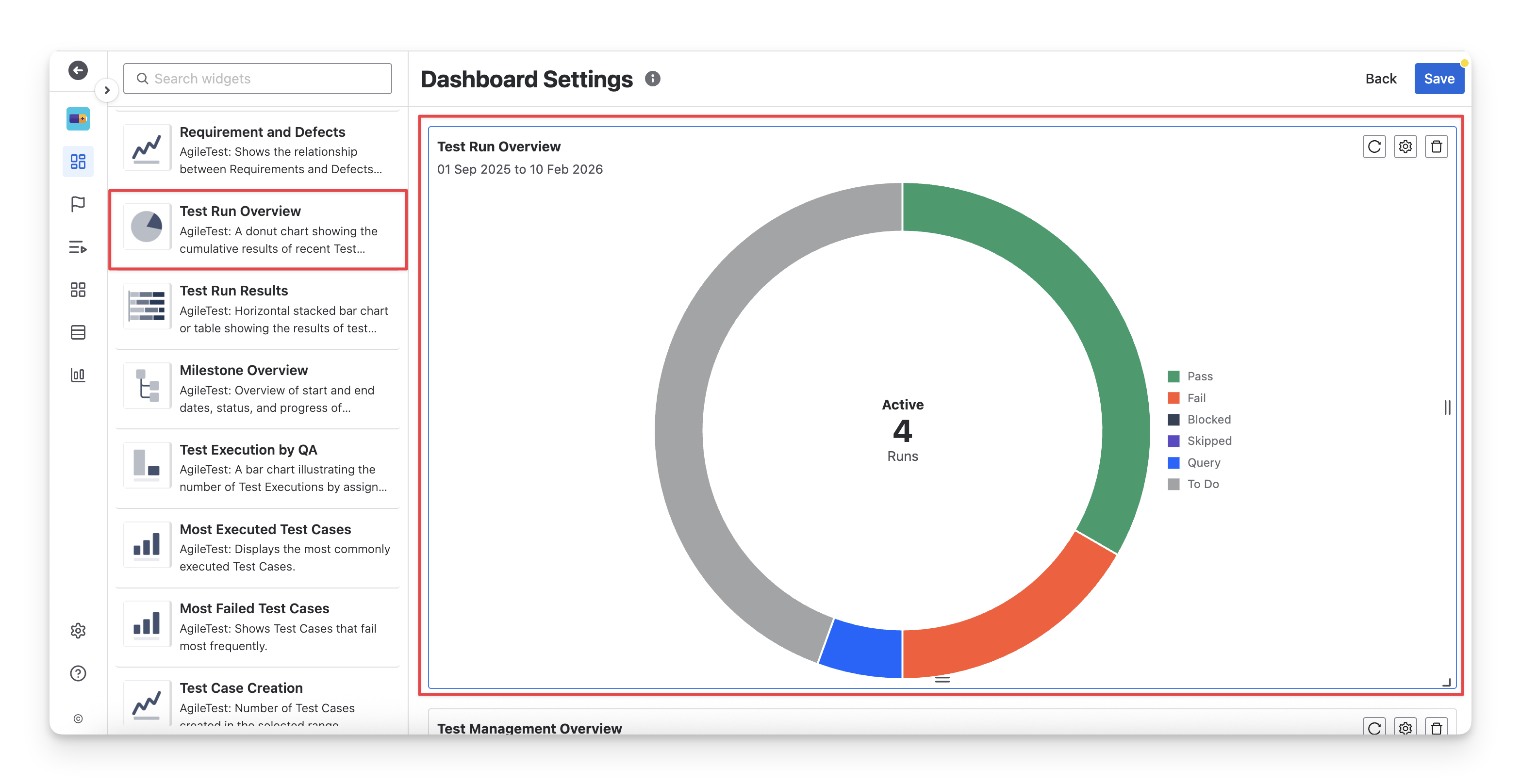 Test Run Overview is useful during daily standups, test cycle tracking, and release checks when QA teams need to check how many test runs (script tests) are completed in general. This widget summarizes all test runs within the selected time range and displays their distribution by status (FAIL PASS SKIPPED BLOCKED QUERY TODO) in a single donut chart. You can use this widget to: