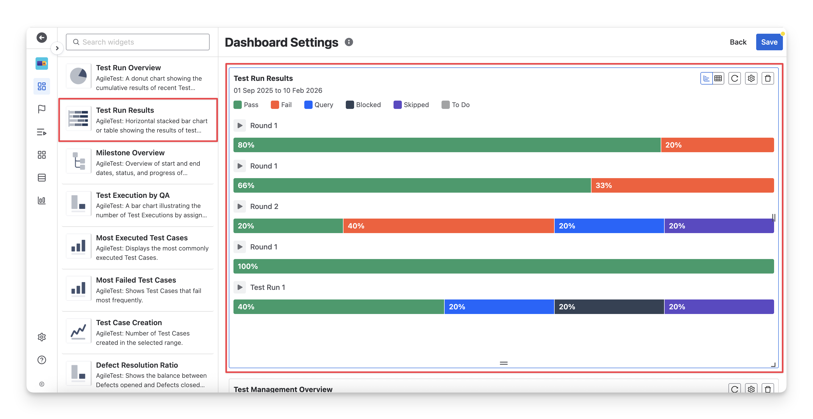Test Run Results is designed for QA teams who need a detailed breakdown of test item status across individual test runs in script tests. This widget displays each test run along with execution statuses (FAIL PASS SKIPPED BLOCKED QUERY TODO).