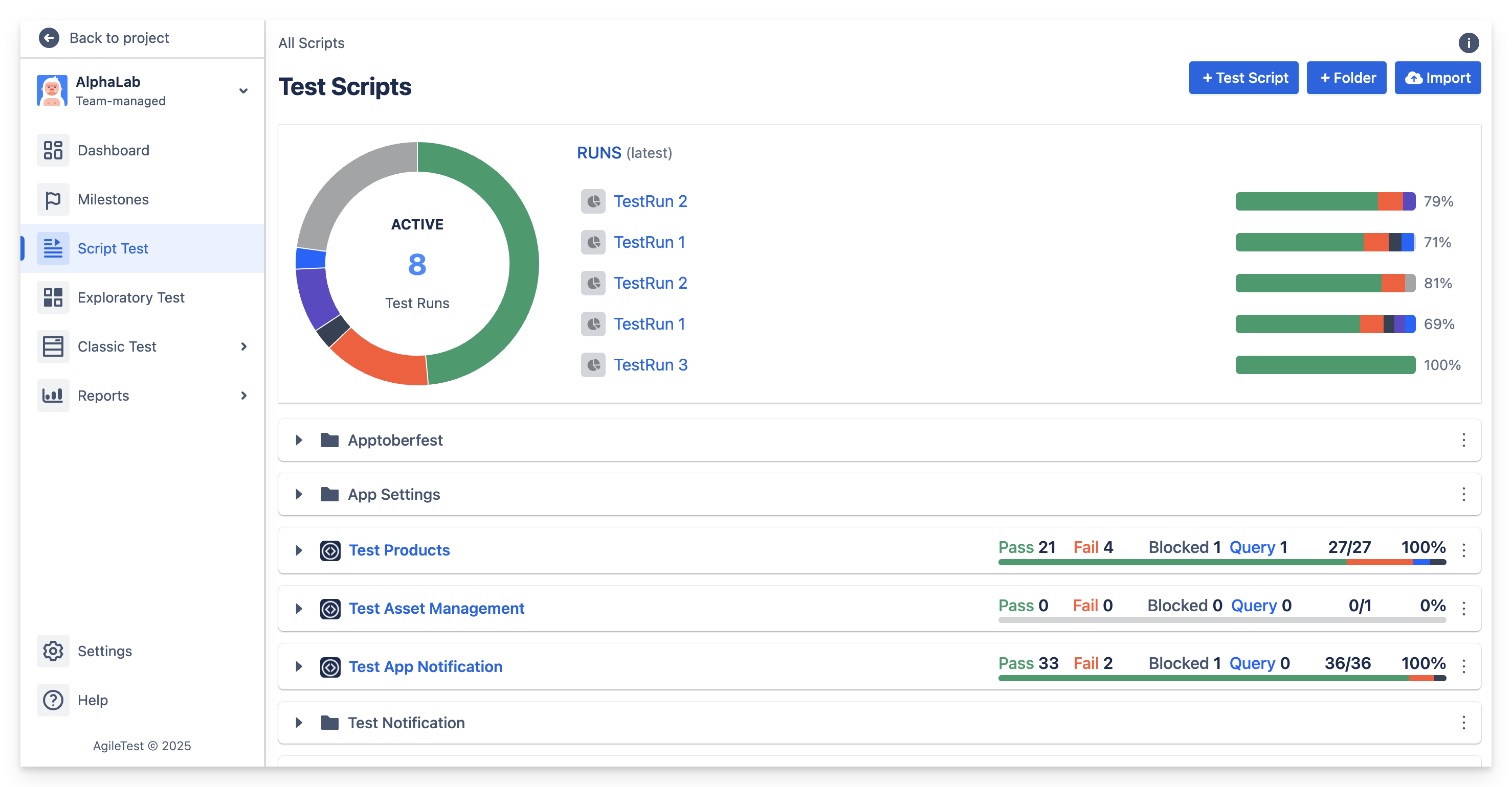 To access the Scripts list go to AgileTest from the Project sidebar and find Scripts. You can also access the AgileTest board of the project by accessing Apps → AgileTest, find the project in the list and click on it.