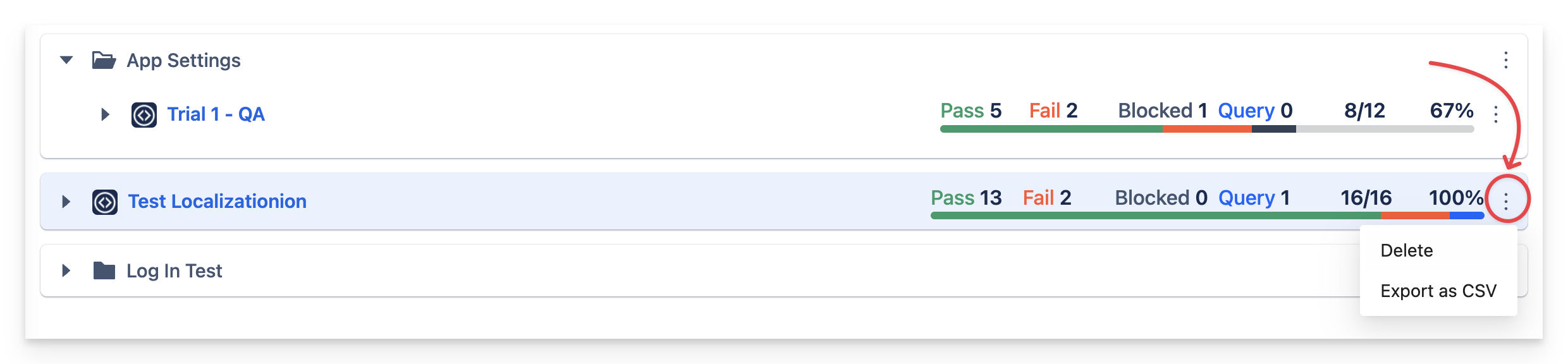 You can click on the three dots icon on each row to open the menu which allow delete and export as CSV