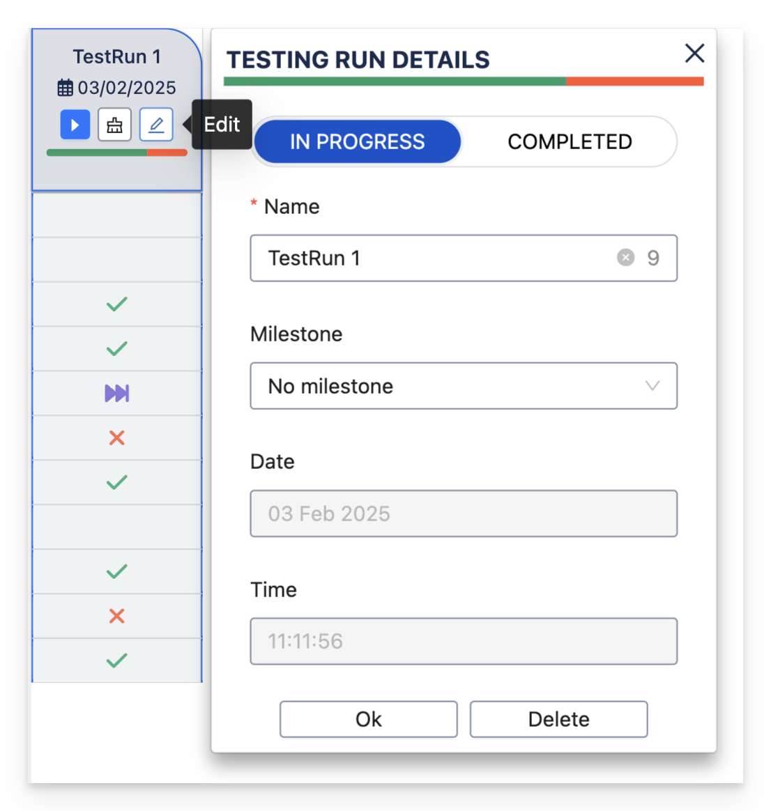 Edit Test runs: Make changes to the Test Run details - Rename, Link milestones.
