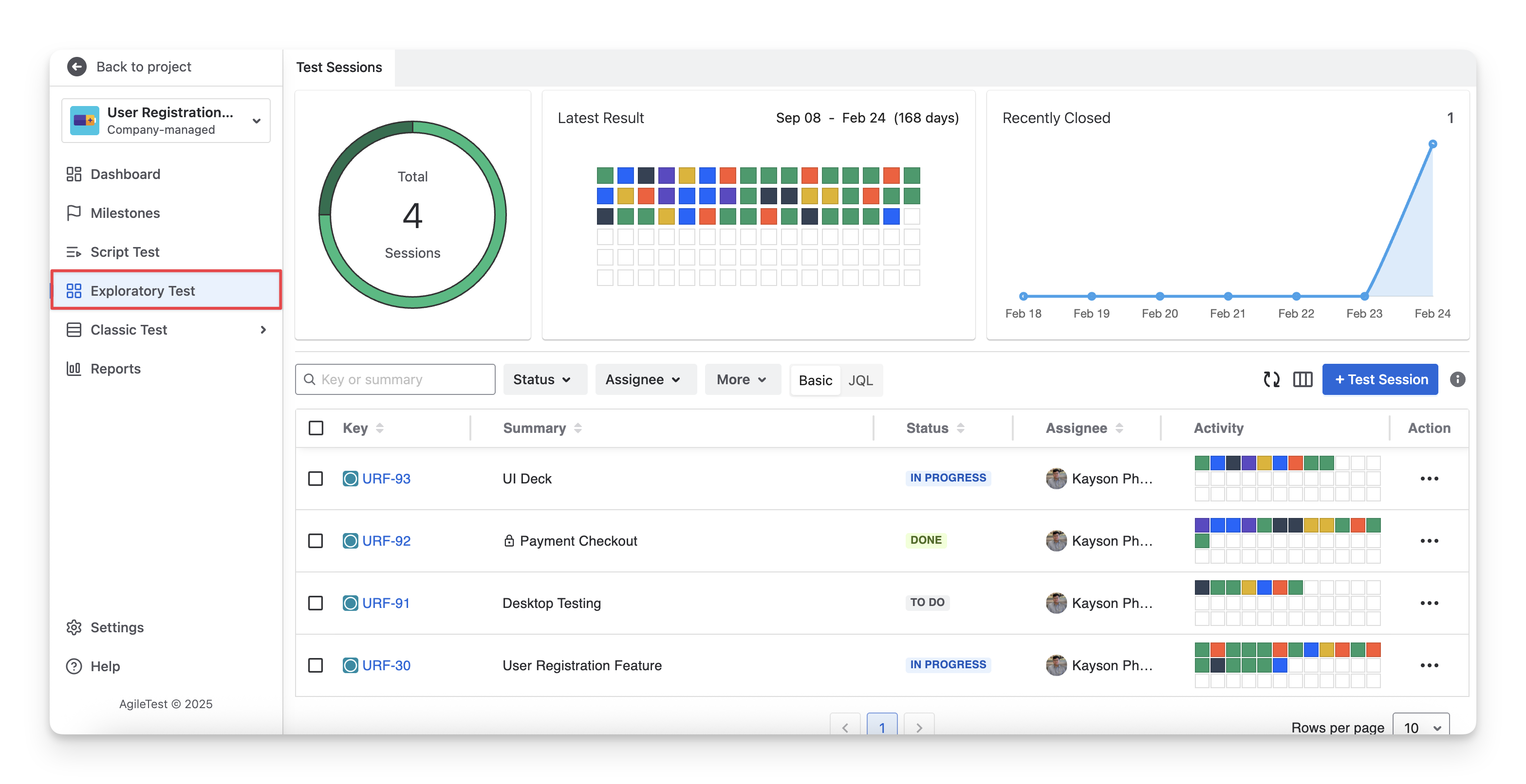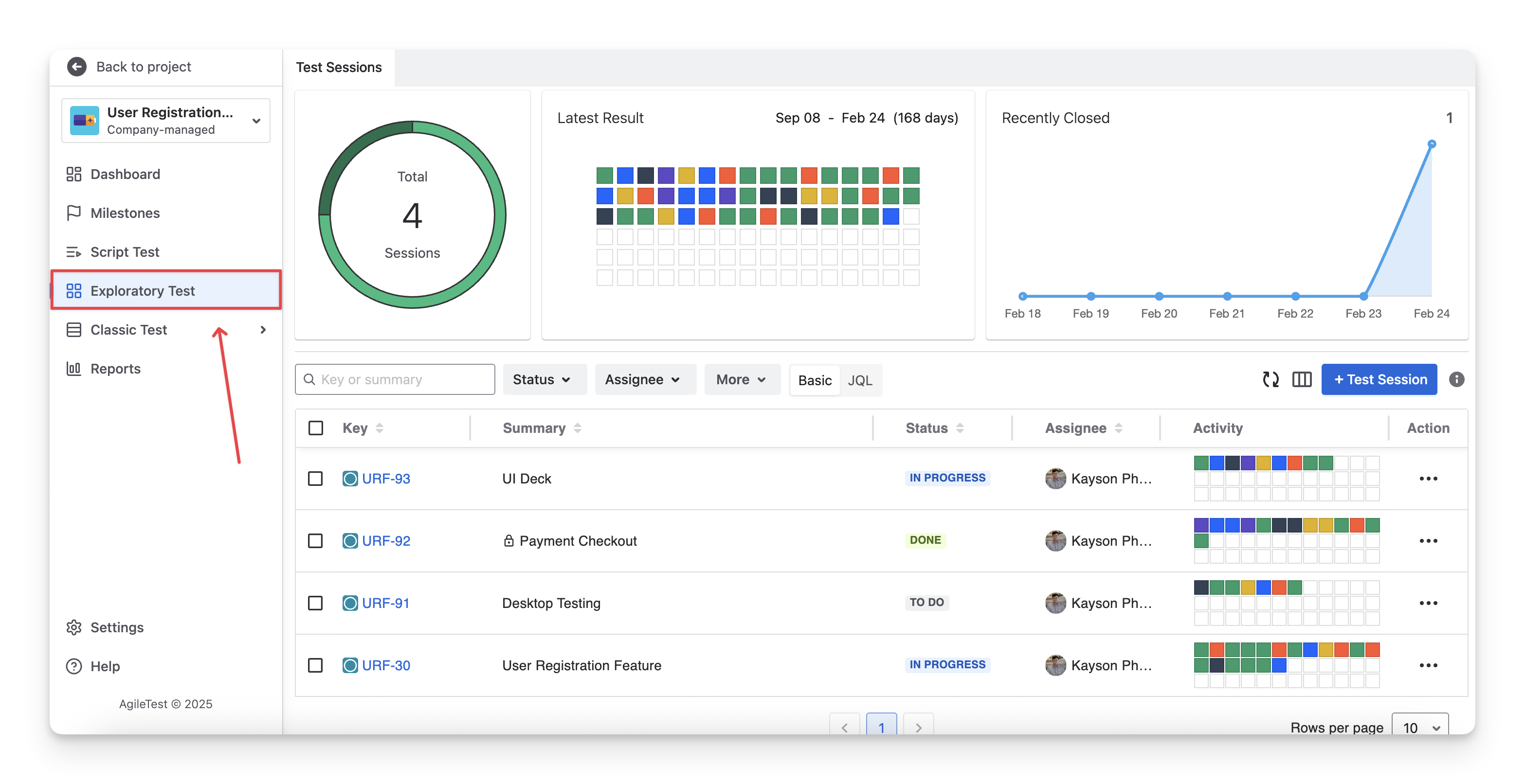 You can find your exploratory tests in 2 areas: AgileTest Exploratory Test Section and Jira Sprint Board.