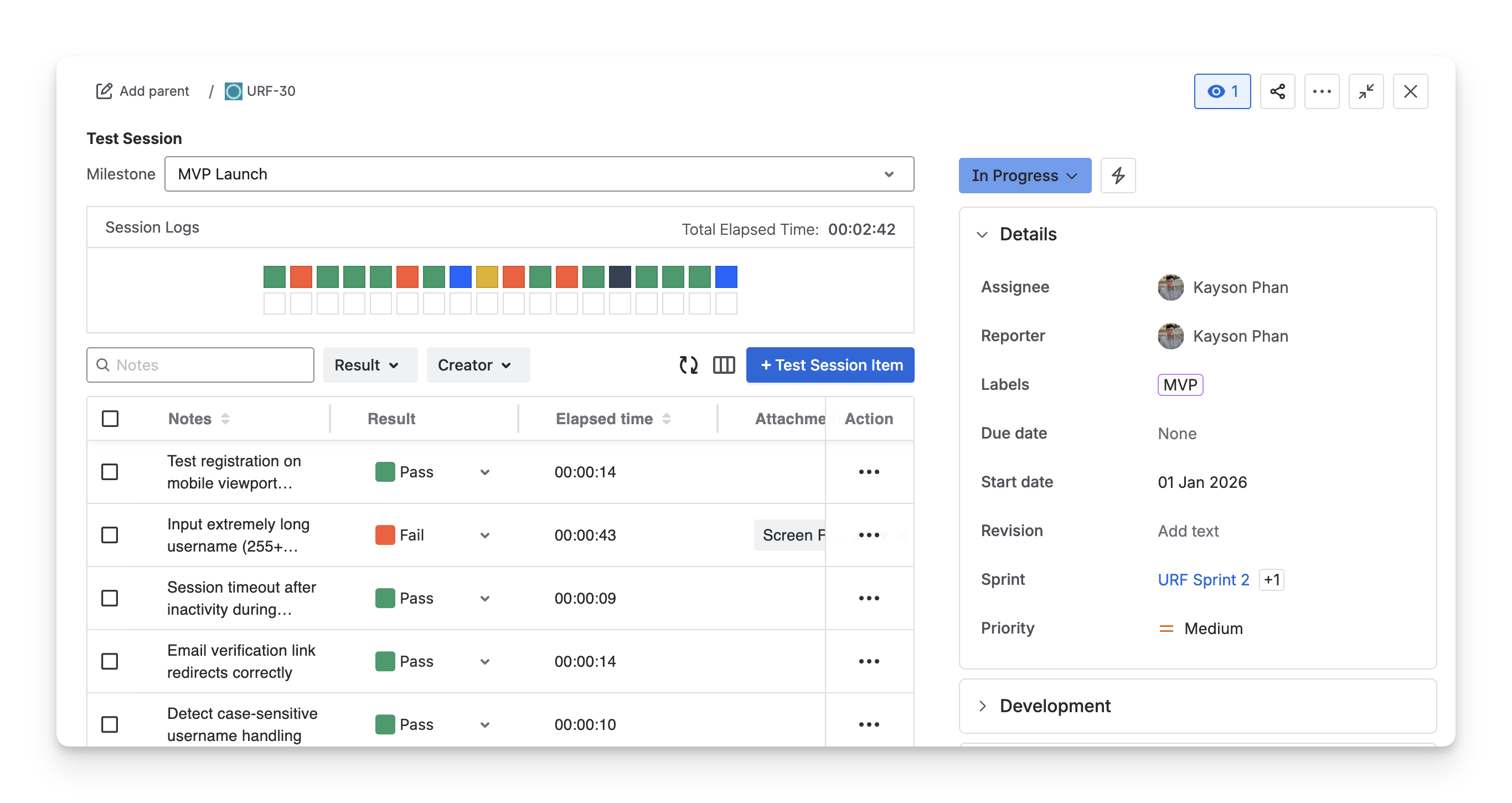 Documentation | Test Execution Results can be tracked in Milestone, Dashboard, and Reports. | Test Session Results can be tracked in Milestone. |