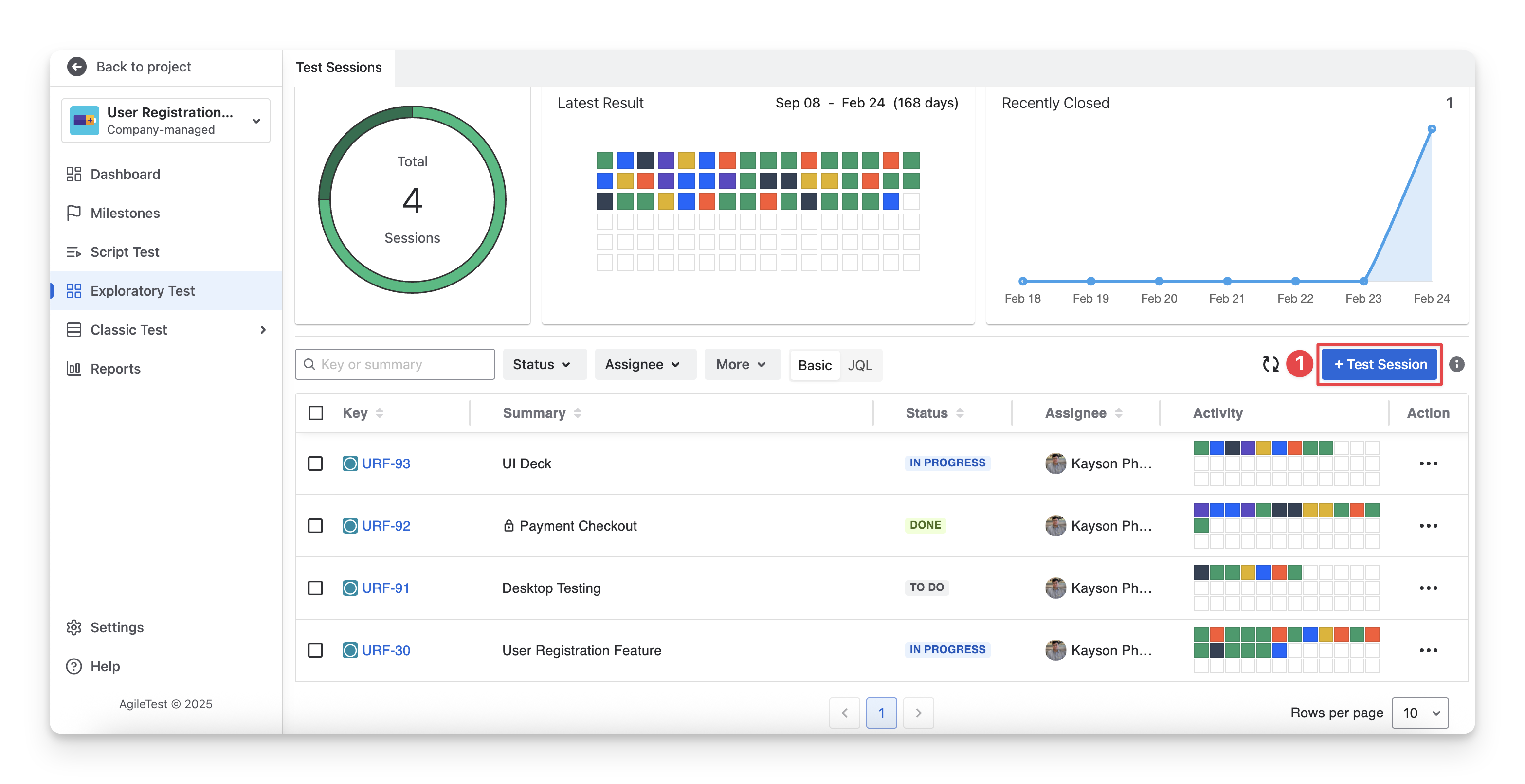 Inside the Exploratory Test section, click on the “+ Test Session” button.