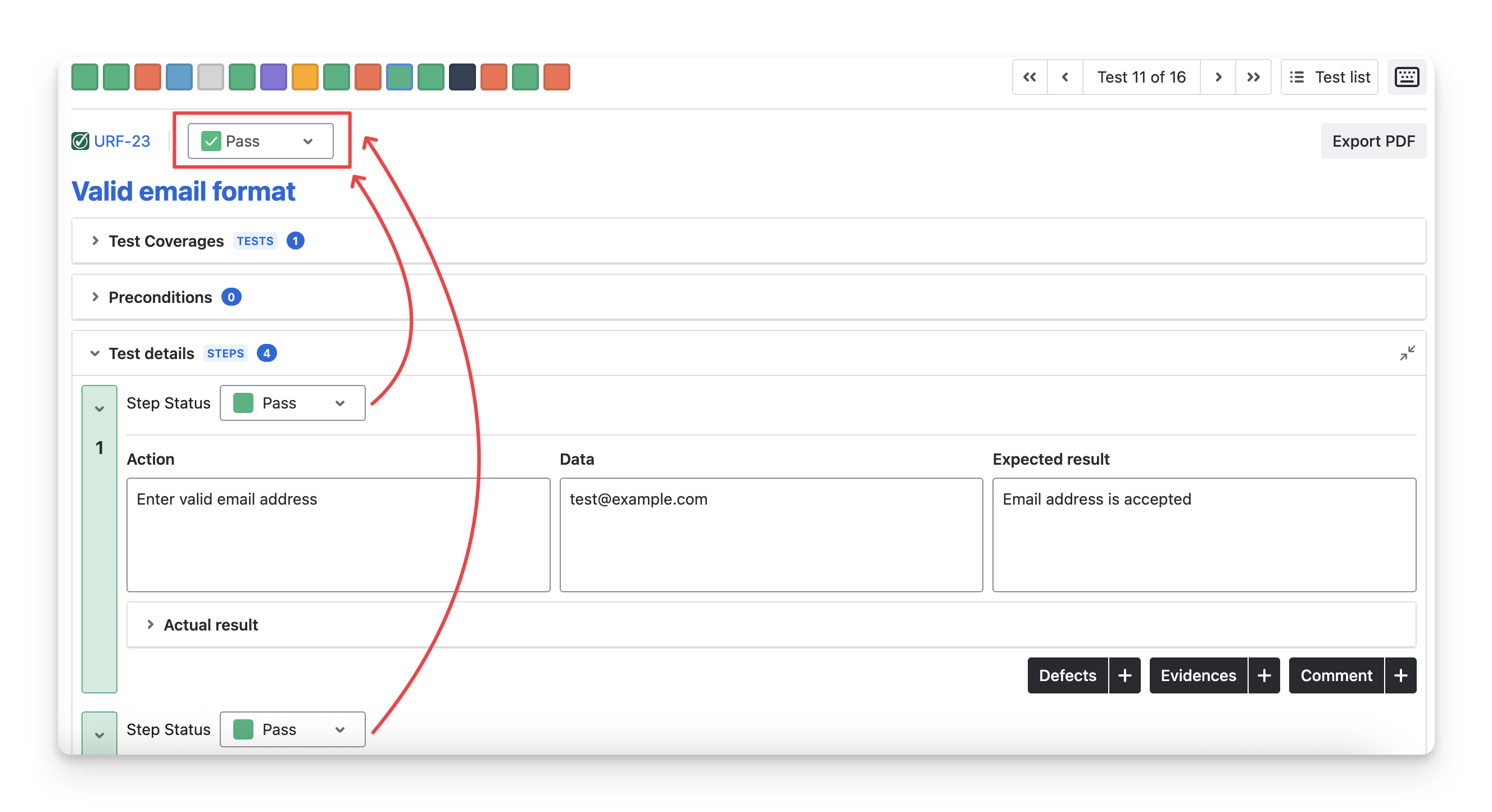 Example 1: If a test step has a FAIL status, the overall test case will be marked as FAIL, even if other steps have a different status.