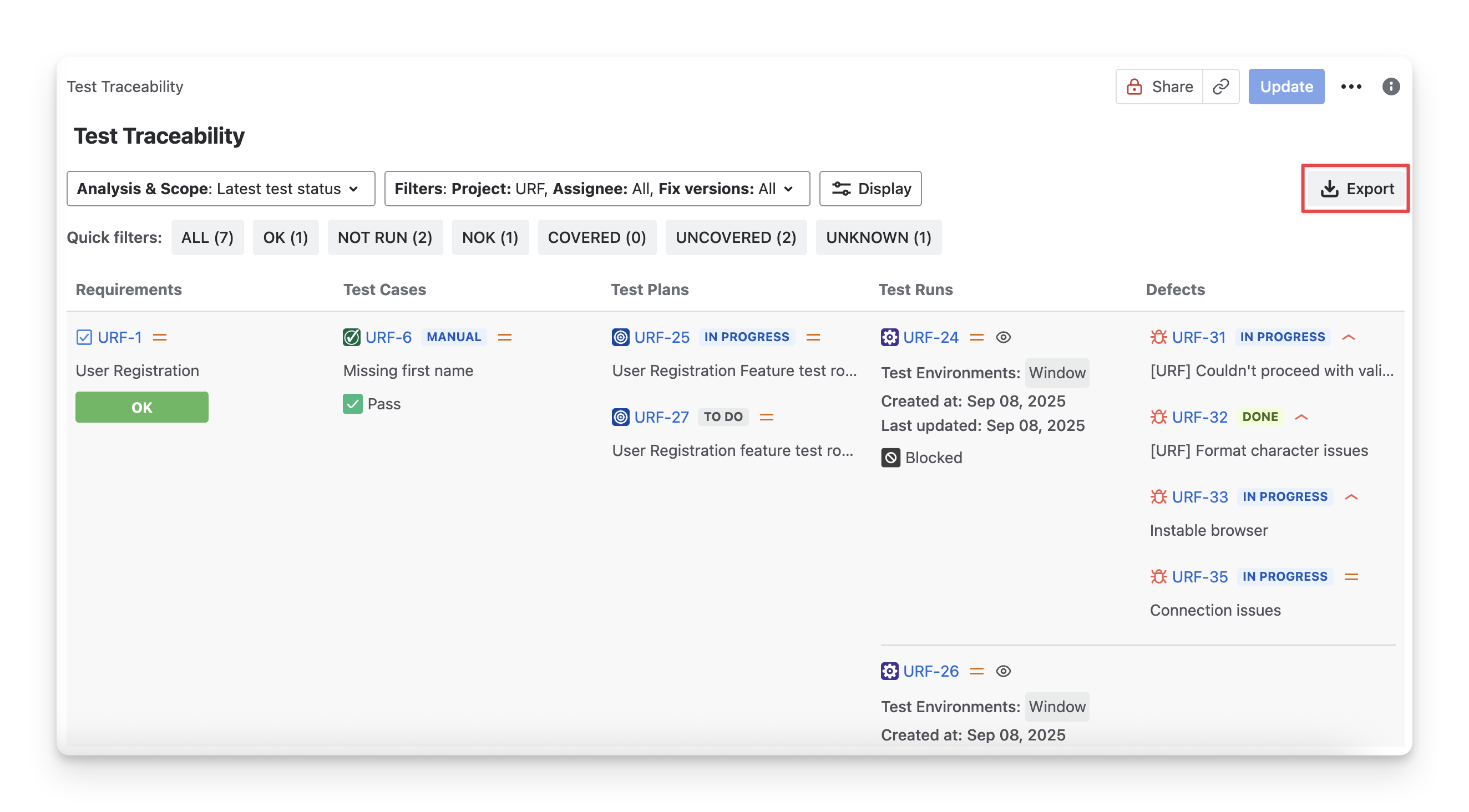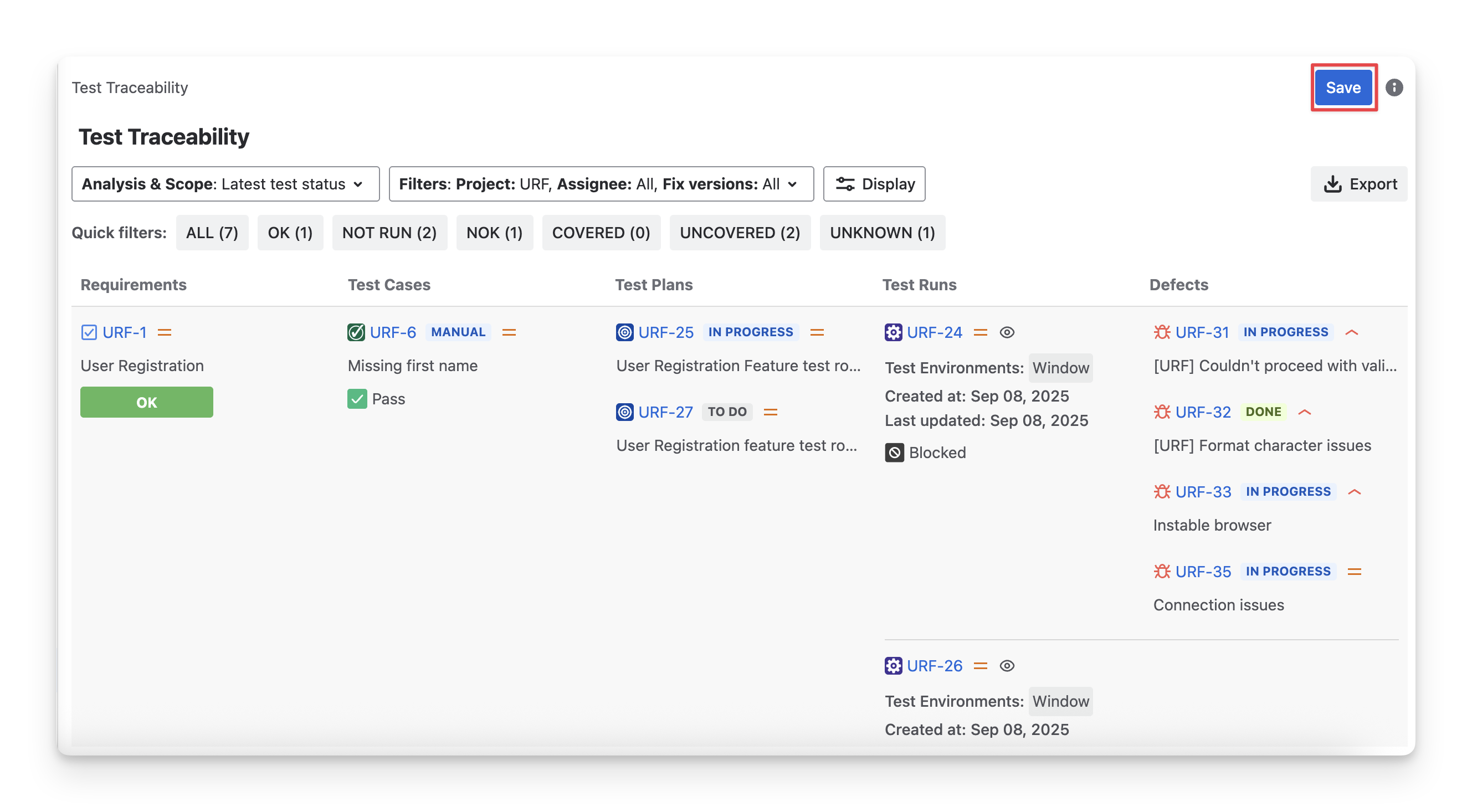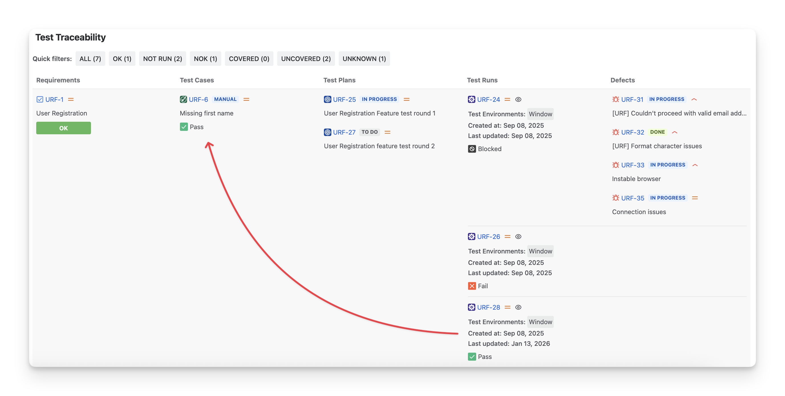 By presenting all related testing artifacts in one place, this report helps teams verify testing completeness, identify any gaps, and quickly understand the impact of test executions or defects on specific requirements.