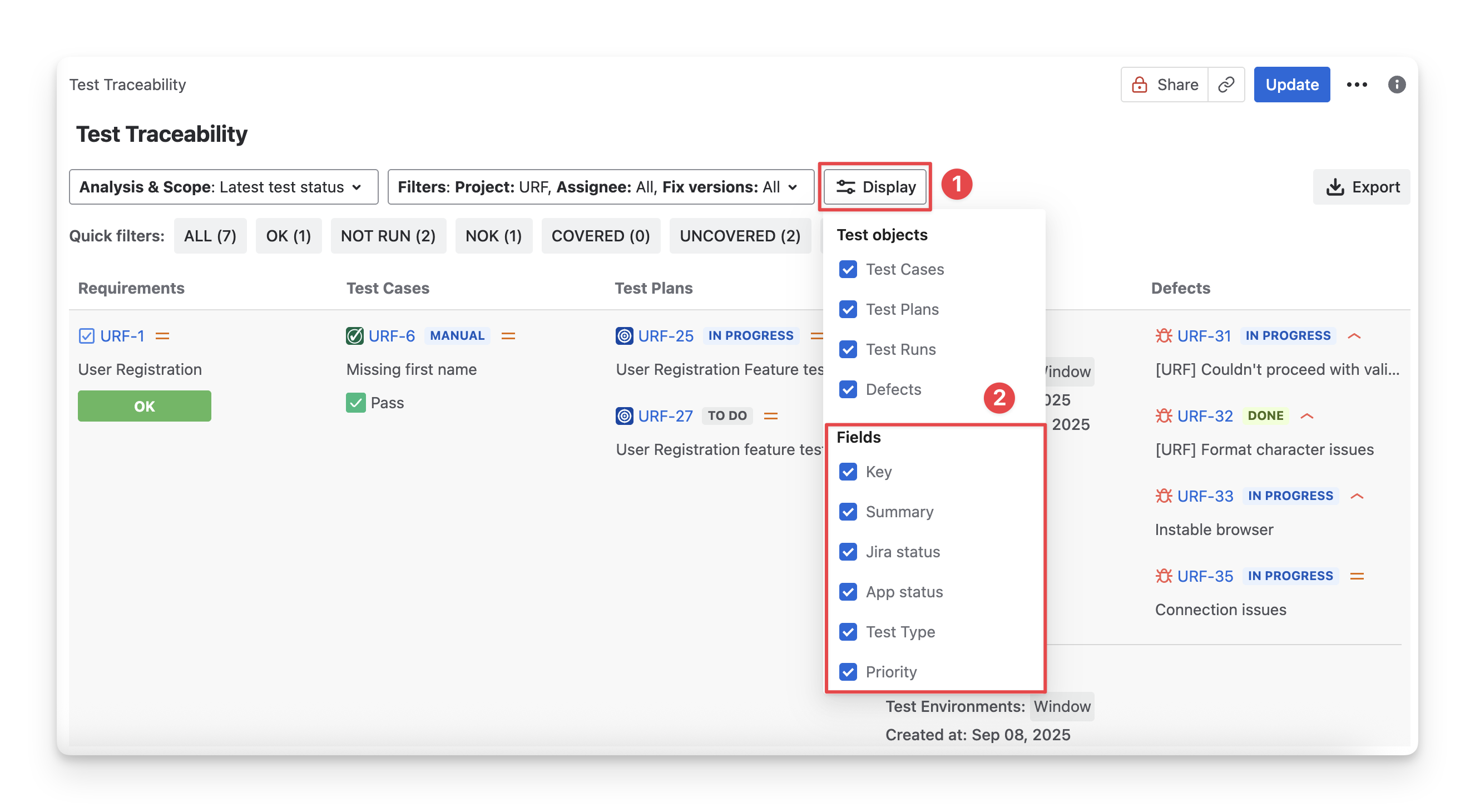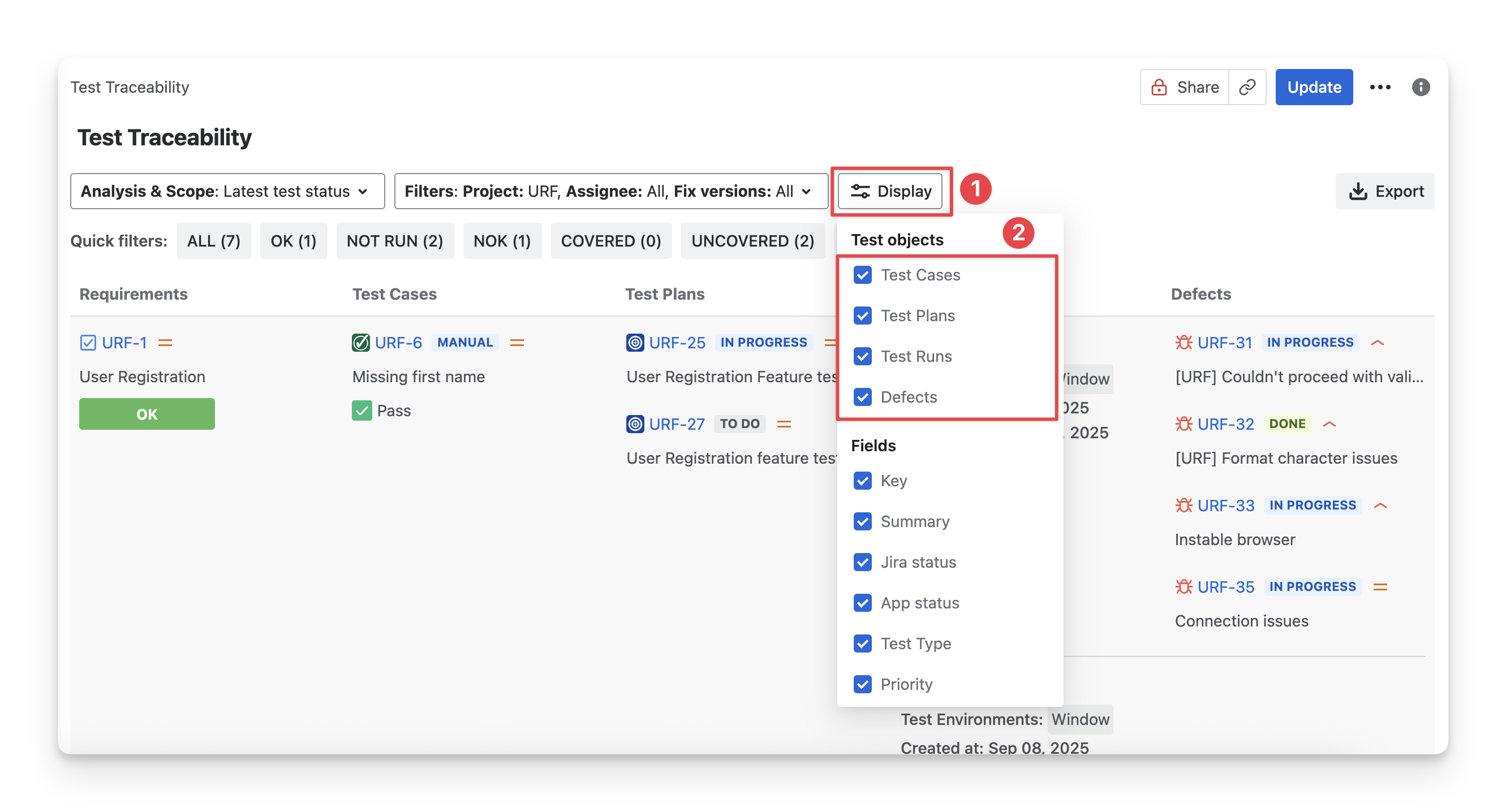 Select/deselect any options to show/hide these columns in the Test Traceability Table.