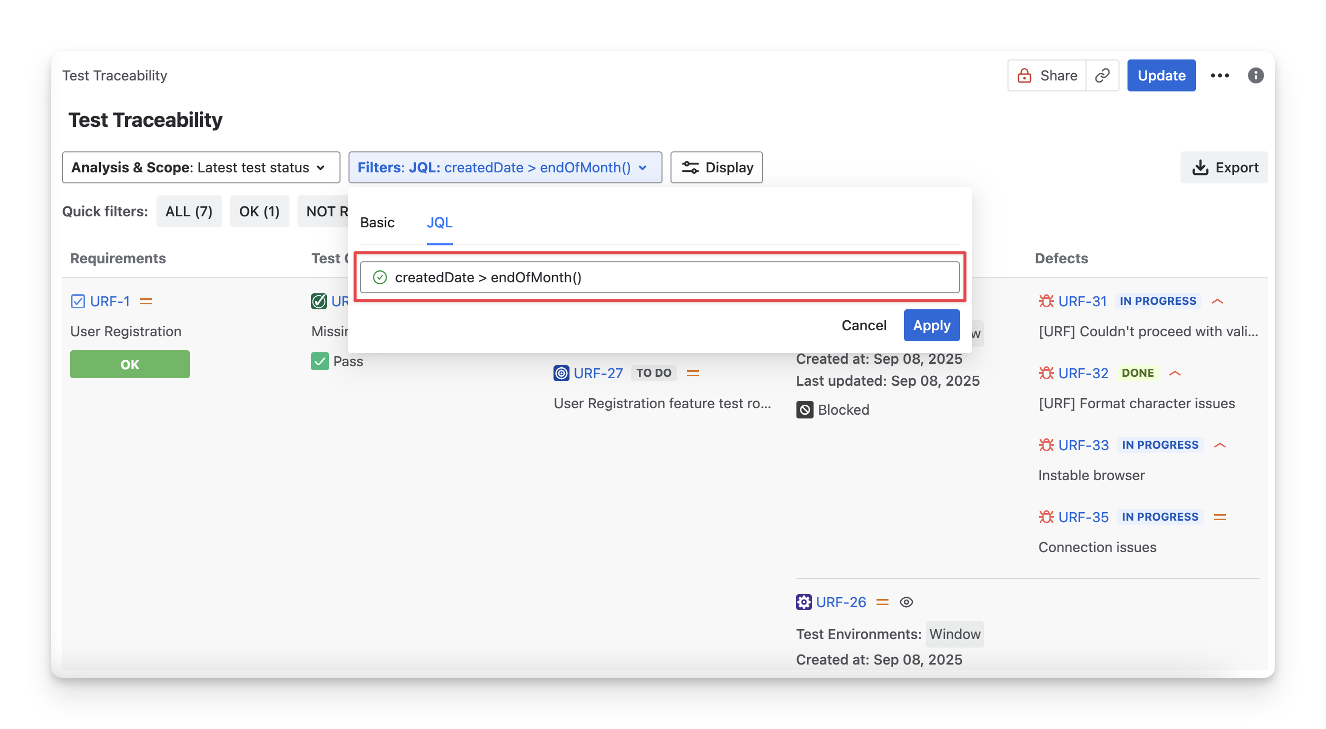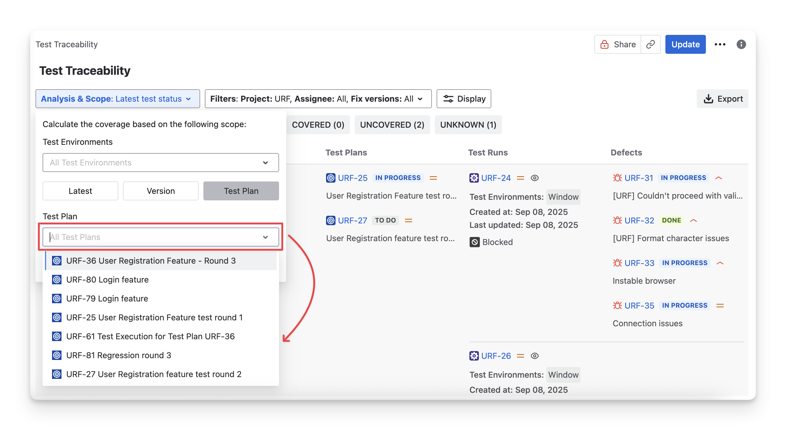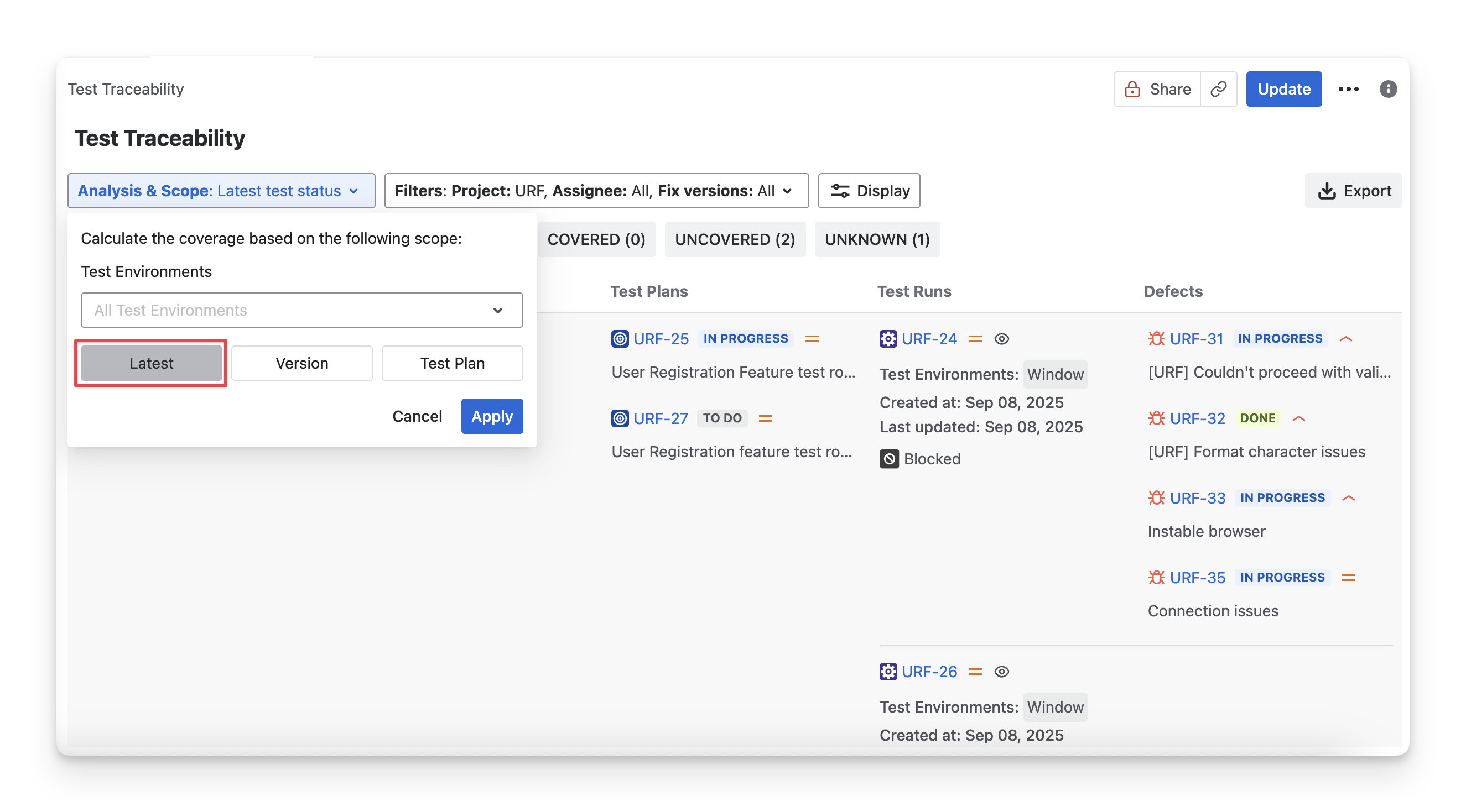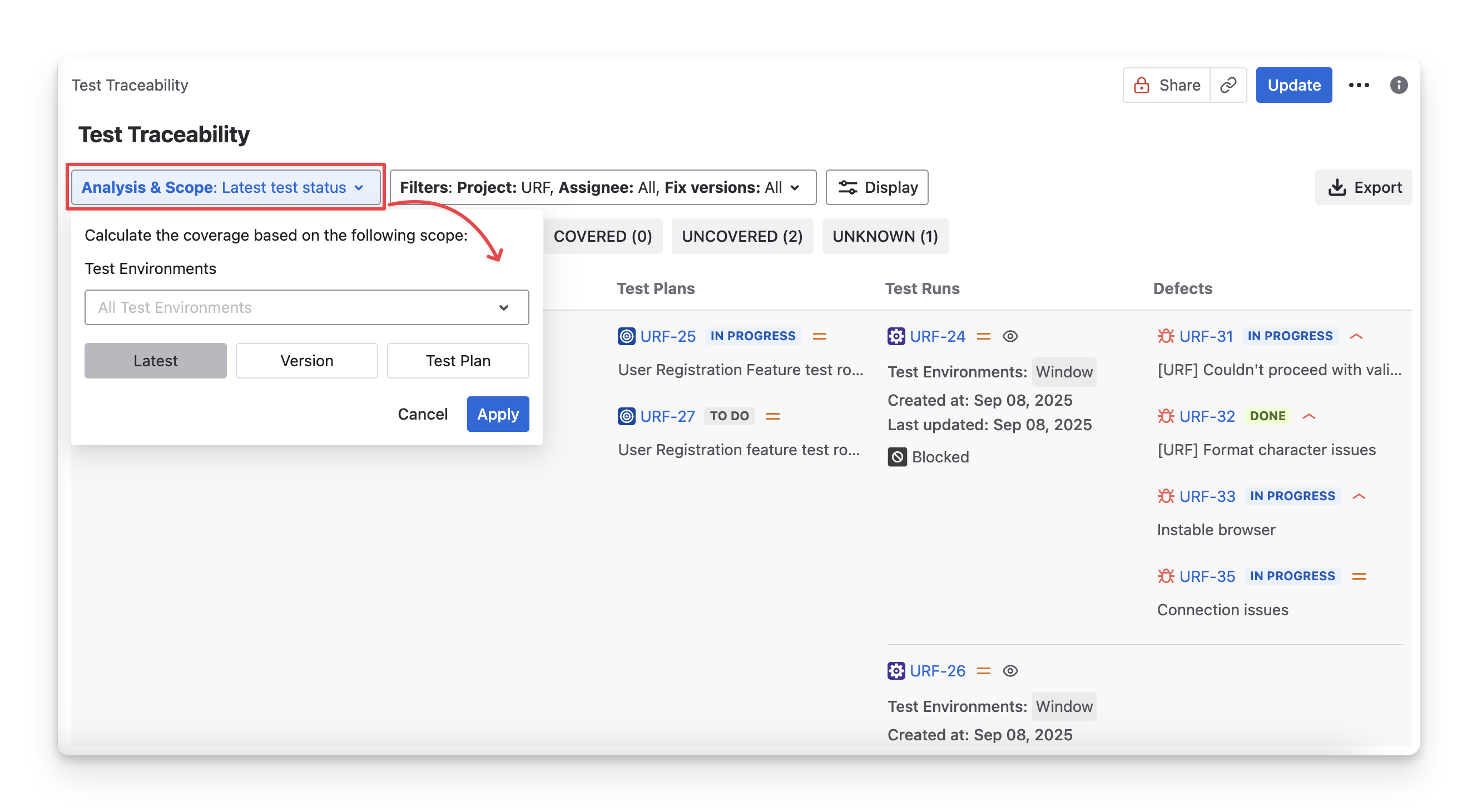 Control how requirement status is calculated by selecting which test cases are included in the analysis using the Analysis & Scope dropdown.