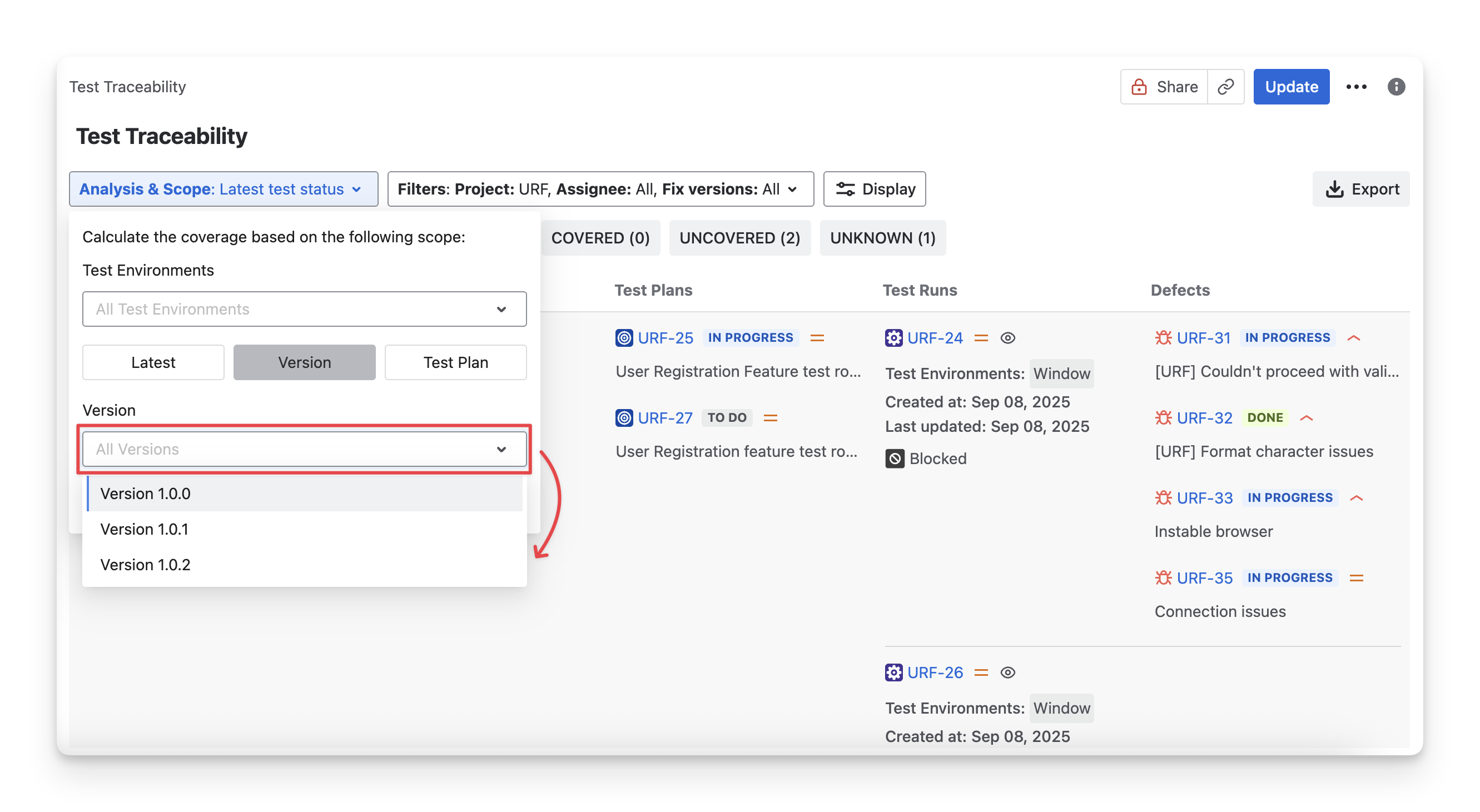 Version: Only calculate status from test cases associated with a specific Jira fix version.